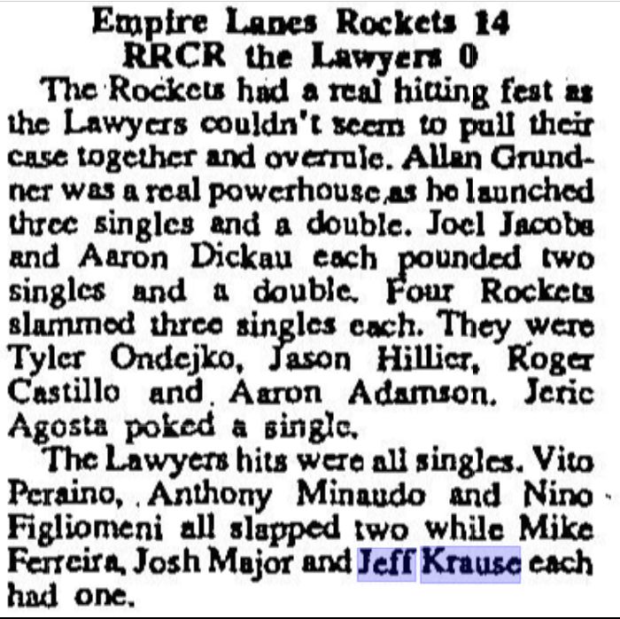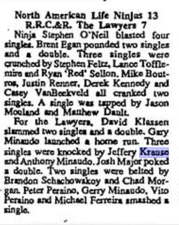 Minor baseball scores ... ATOM ... North American Life Ninjas 13 R.R.C. & R. The Lawyers 7 .. For the Lawyers ... Three singles were knocked by Jeffery Krause ...