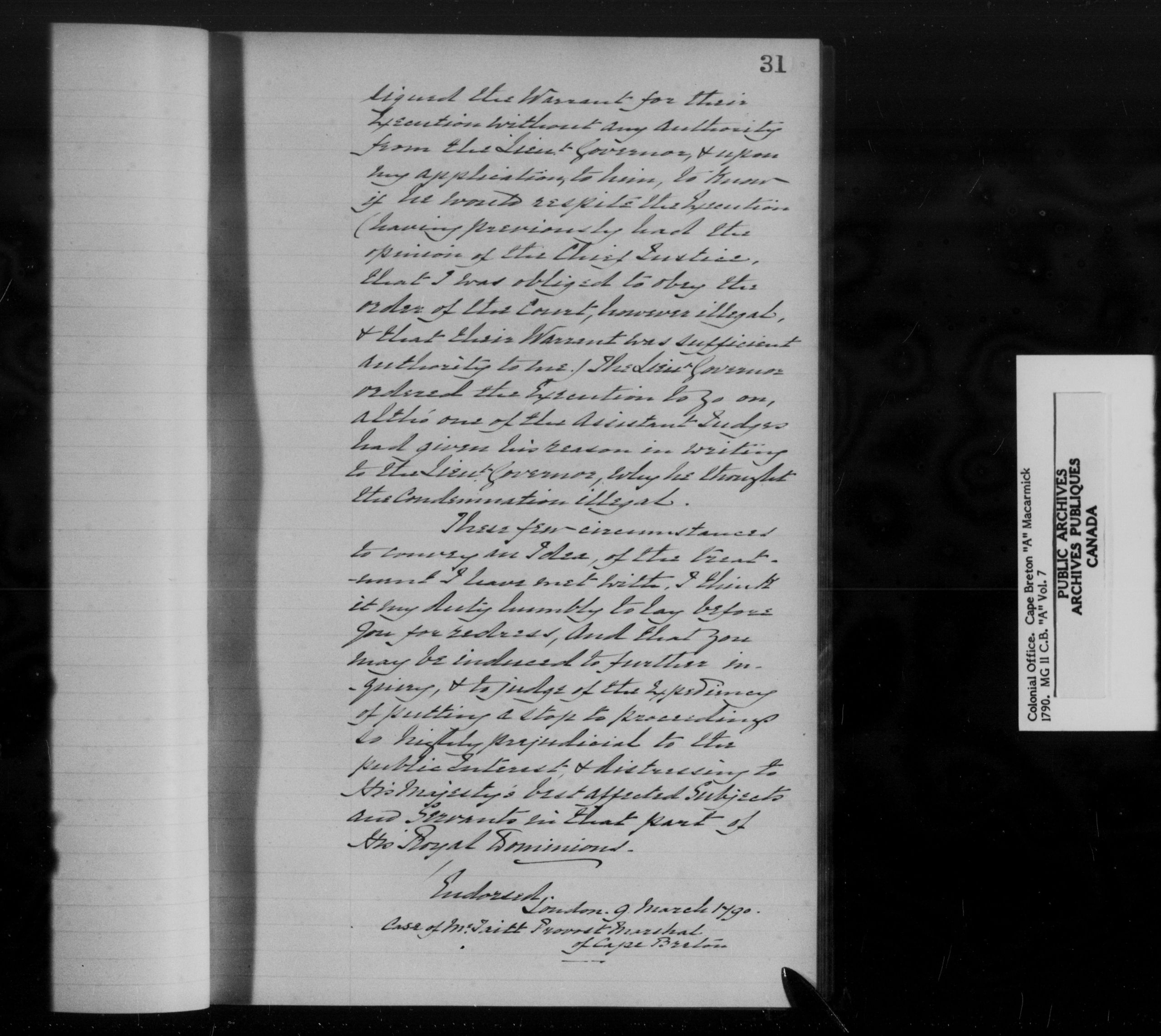 Nova Scotia and Cape Breton, Original Correspondence (CO 217), Colonial Office, Cape Breton "A", Macarmick, 1790, M.G. 11, C.B., Vol. 7, March 9, 1790, pp. 14, 20-21, 31 (Col. Cor. C.B. Vol. 73, March 9, 1790, p. 1.)