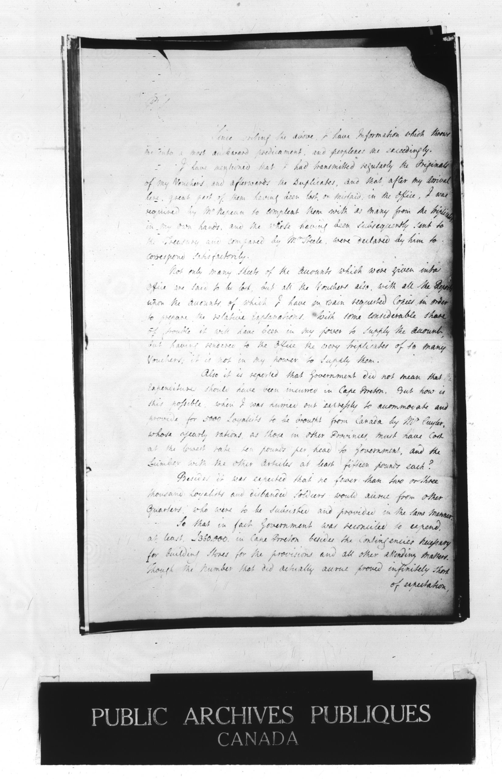 NO A ... Narrative of the Motives of Lieut Govr DesBarres Appointment to Cape Breton, and of the Circumstances of the Expenditures for the public Service there, with Remarks ... [Page 9] ... I arrived [in Sydney] at the Spring 1785 ... No time was lost in transmitting a State of our Condition with a Report of my proceedings, and an Estimate # of the Current expence of what appeared to me necessary to be done on the Spot, to England, depending that the advance of the Season would infallibly bring the promised Supplies, at least the Provisions, and lessen the local inconvenience & expence; And I proposed at the same time a method appearing conducive to perspicuity for reimbursing all manner of occasionally necessary expenditures which was to draw Bills on my personal agent in favor of those who made the Supplies and to transmit Quarterly Accounts to office for the [Page 10] for the [sic] part of the expence chargeable, to the public - the Amount thereof to be paid into his hands. In this manner I drew £ 3000 on the Treasury upon amount of what I had already advanced, which was paid to the agent, who wrote to me, that, in terms of his communications with Office, my Bills would be honored, and every Instruction, that should be deemed necessary transmitted to me in due time. |