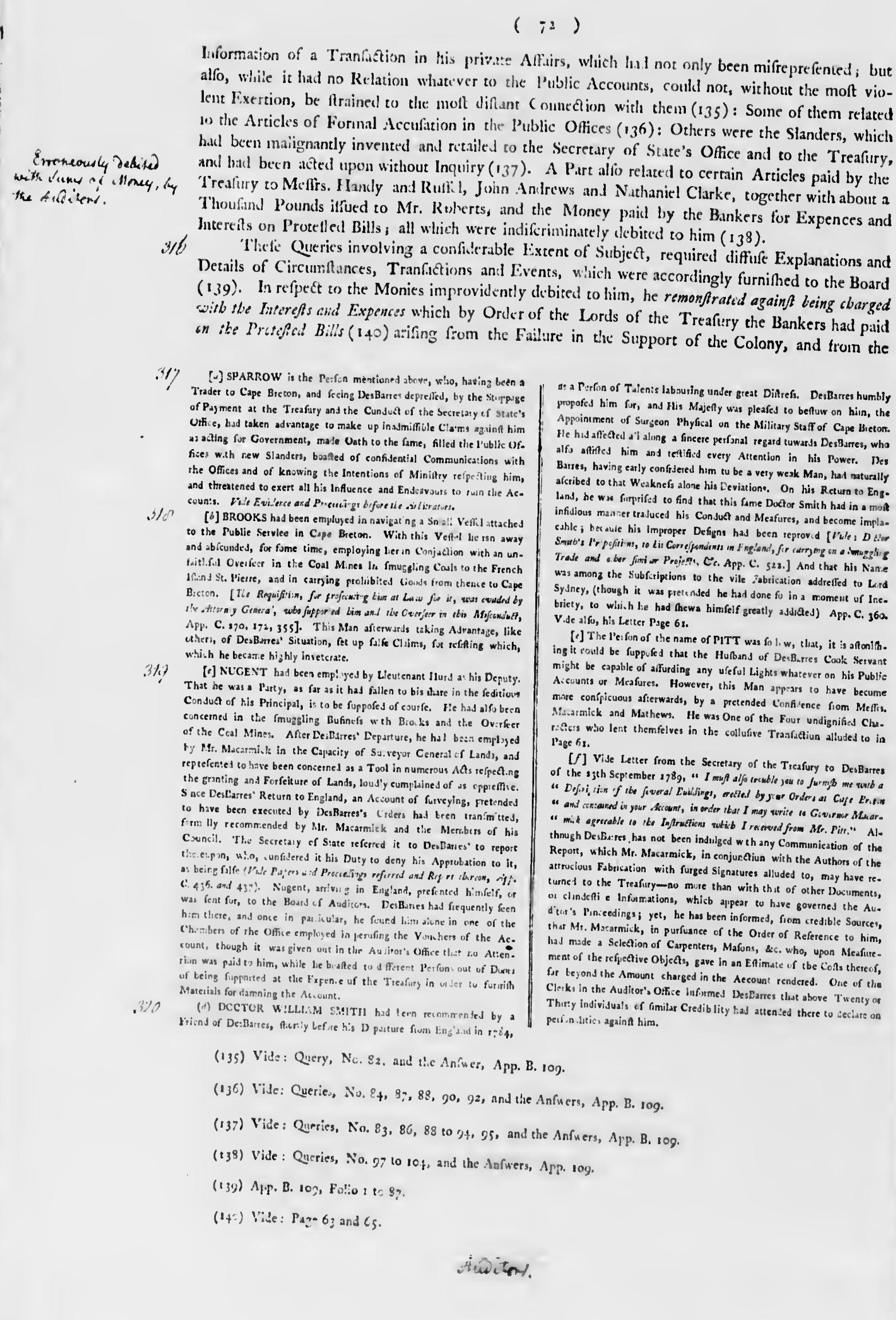 ... (a) Sparrow is the Person mentioned above, who, having been a Trader to Cape Breton, and seeing DesBarres depressed, by the Stoppage of Payment at the Treasury and the Conduct of the Secretary of State's office, had taken advantage to make up Inadmissable Claims against him as acting for Government made Oath to the Same, filled the Public Offices with new Slanders, boasted of confidential Communications With the Offices and of knowing the Intentions of Ministry respecting him, and threatened to exert all his Influence and Endeavours to ruin the Accounts. Vide Evidence and Proceedings before the Arbitrators ...