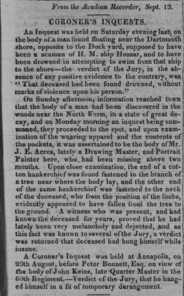 Coroner's Inquest, 7 Sept on the body of Mr. J. E. Acres - Halifax