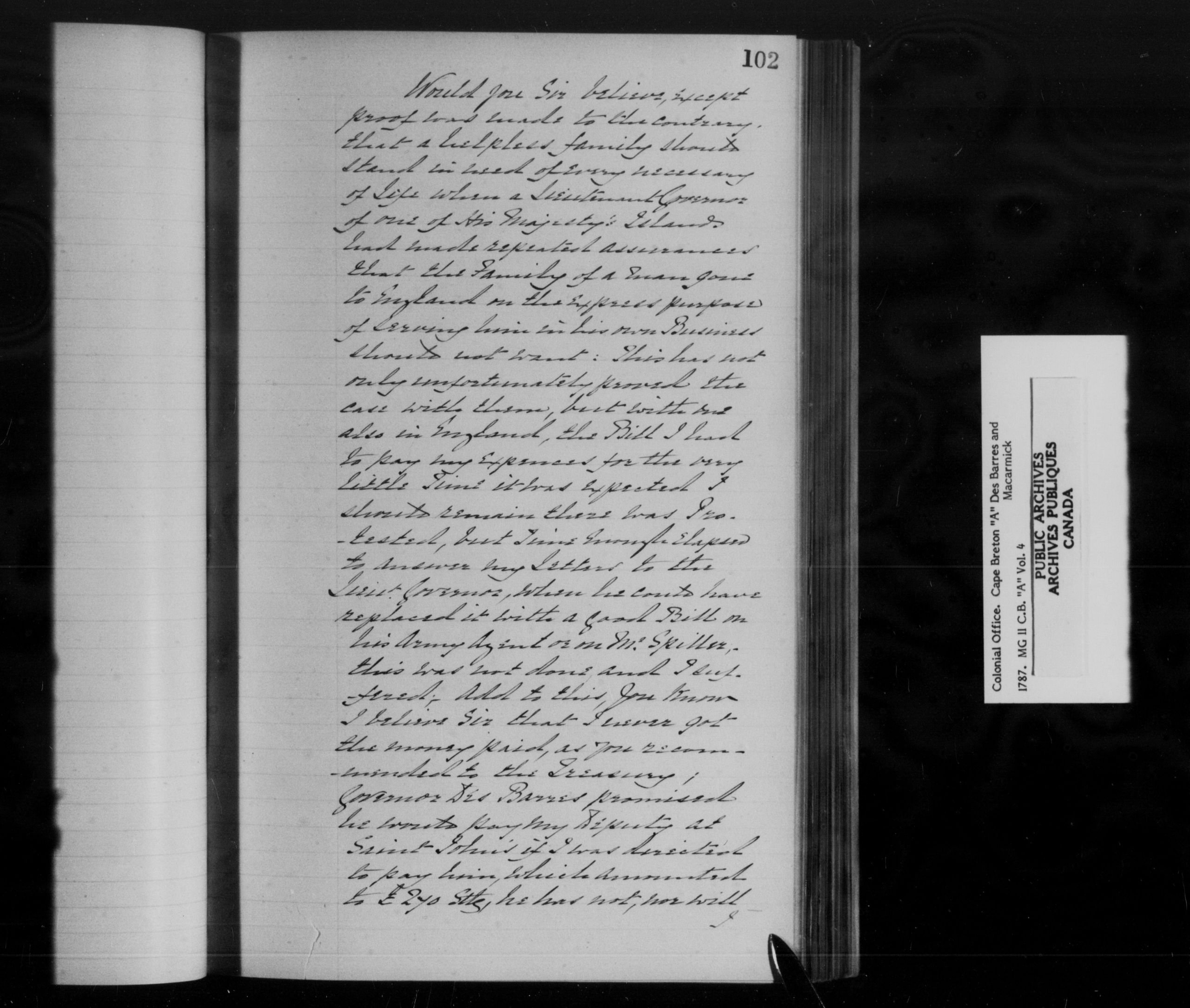 Nova Scotia and Cape Breton, Original Correspondence (CO 217), Colonial Office, Cape Breton "A", Des Barres and Macarmick, 1787, M.G. 11, C.B., Vol. 4, October 4, 1787, pp. 101- 107 [Col. Cor. C.B. 64, p. 69, October 4, 1787]