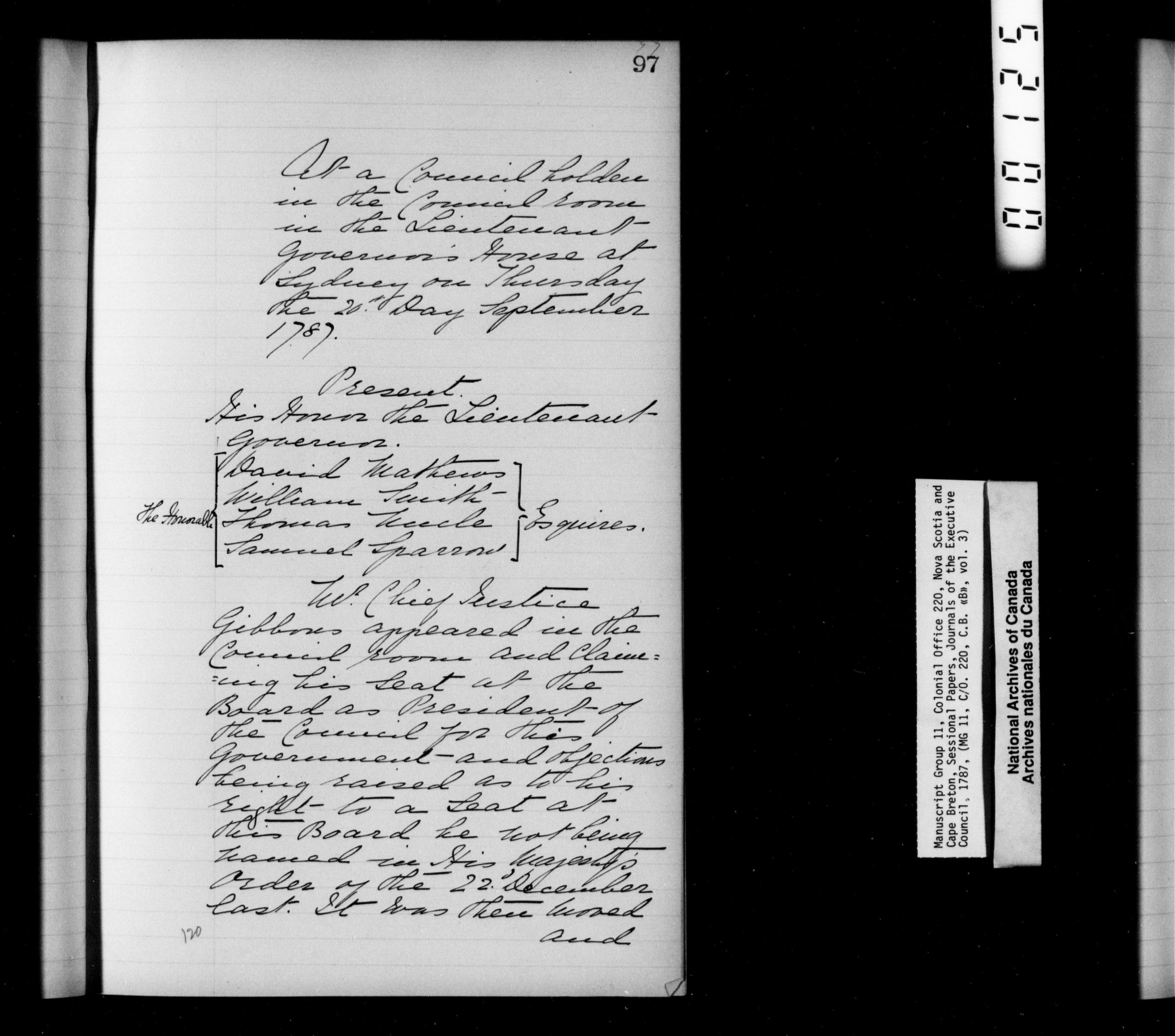 Manuscript Group 11, Colonial Office 220, Nova Scotia and Cape Breton Sessional Papers, Minutes of Executive Council, 1787 (M.G. 11, C.O. 220, C.B. "B", Vol. 3  ff. 97-101