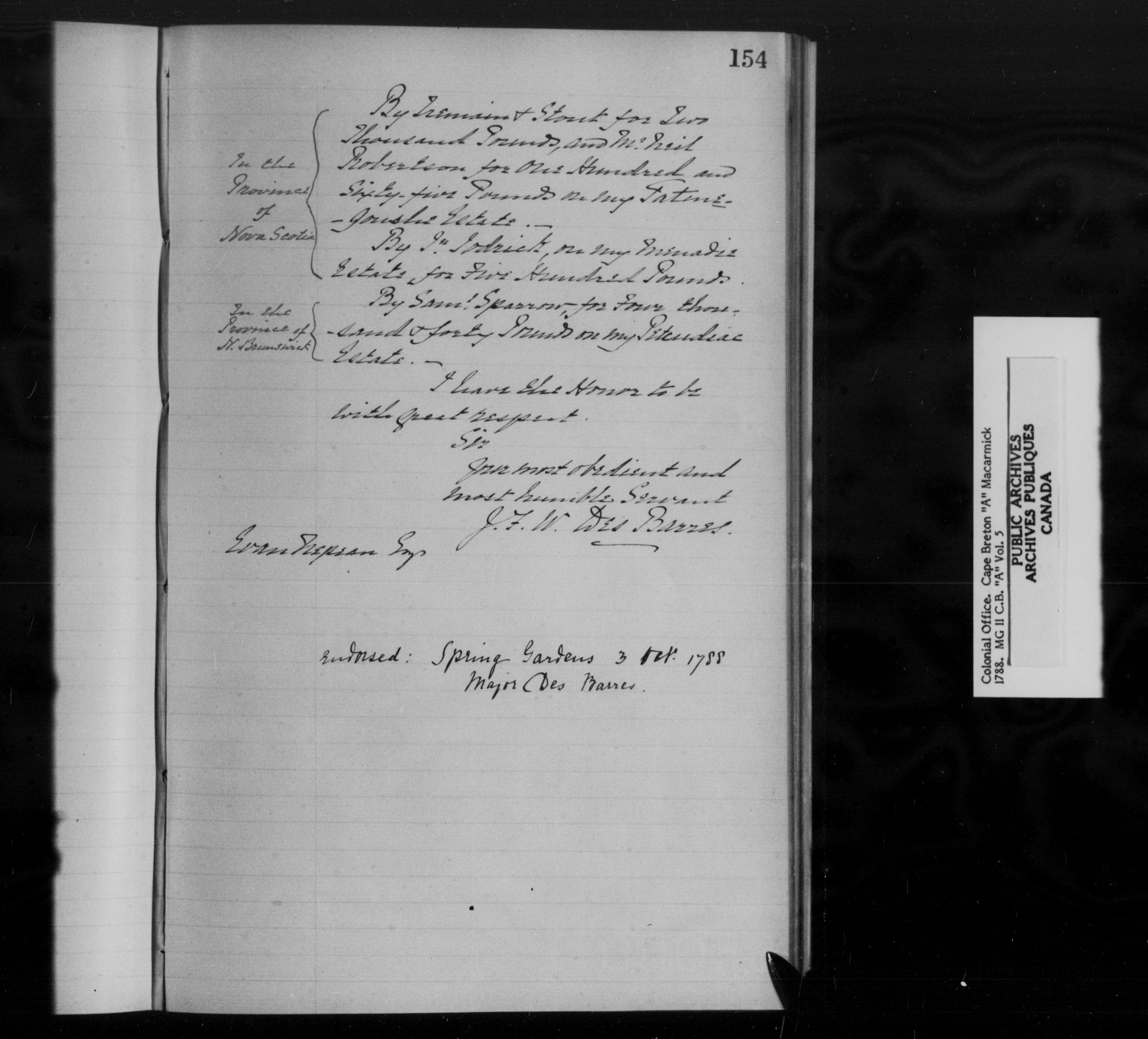 Nova Scotia and Cape Breton, Original Correspondence (CO 217), Colonial Office, Cape Breton "A", Macarmick, 1788, M.G. 11, C.B., Vol. 5, October 3, 1788,  pp. 153-154 (Col. Cor. C.B. Vol. 64, October 3, 1788, p. 431)