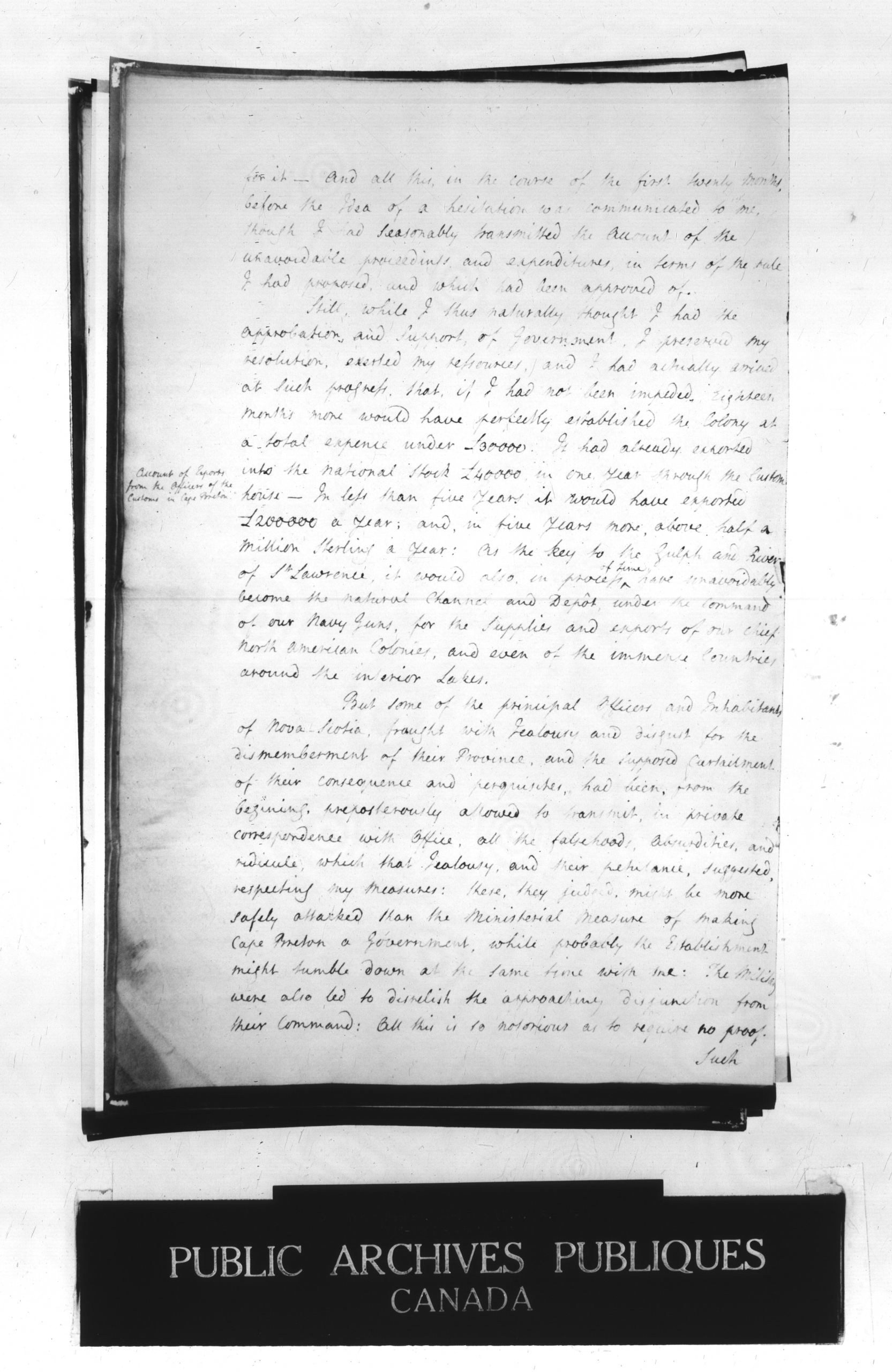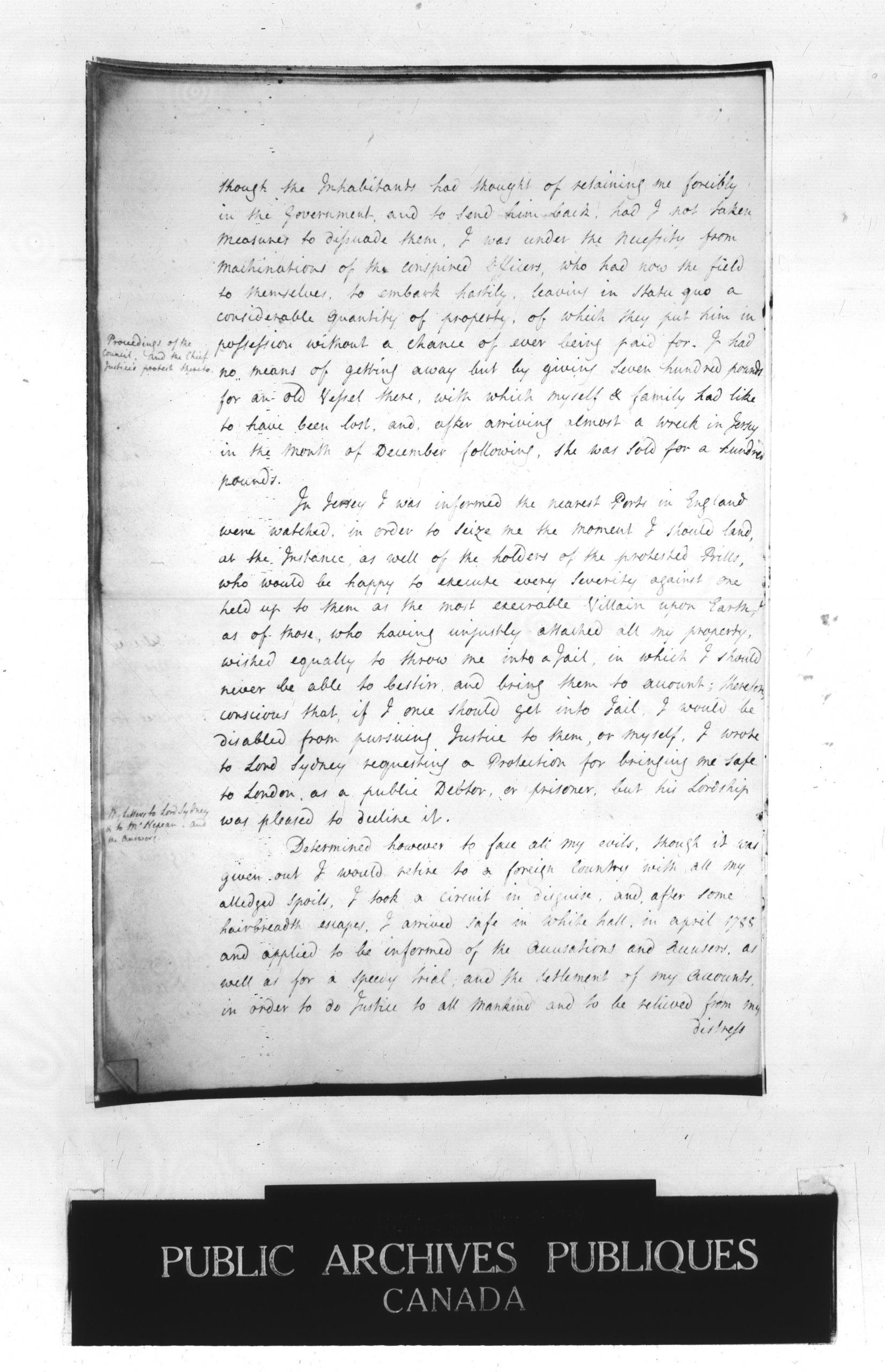 But as it was twenty Months after the Stoppage, and the determination to recall me, before my successor arrived, I was entirely cramped in my exertions of Settlement with the Creditors. Severals took the Advantage of trumping up exorbitant Claims' Estates [Page 17] Estates which I had formed in the Province of Nova Scotia, and had for many years before returned to me from twelve to fifteen hundred pounds a year were attached; As Instances of the devastation upon this occasion about two hundred heads of Cattle which had been leased with the Land on one of my Estates, were brought to the hammer upon an execution for a Bill of £ 209; and Others in proportion; for Bills not exceeding a thousand Pounds, Judgement was taken to the Amount of £ 2000, and an Estate, in a flourishing [?rogress] of Settlement, seized for which it was prosessed to refuse £ 6000 ... |