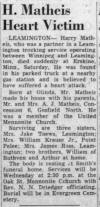 LEAMINGTON— Harry Matheis [Mathies], who was a partner in a Leamington trucking service operating between Winnipeg and Leamington, died suddenly at Erskine, Minn., Saturday, [sic] He was found in his parked truck at a nearby gas station and is believed to have suffered a heart attack.