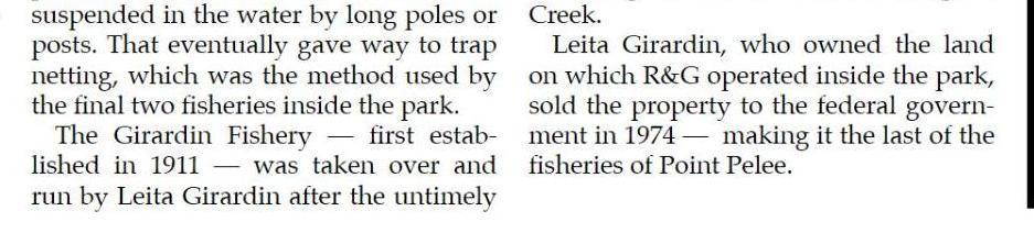 Letta Girardin, who owned the land on which R&G operated inside the park, sold the property to the federal government in 1974 - making it the last of the fisheries of Point Pelee.