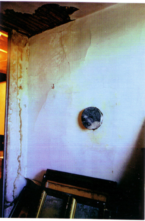 There is a significant horizontal crack at the head of the fireplace opening with the stucco coating spalling along the lintel and horizontal cracks at either side (Fig. 13). There are also north-south cracks in the ceiling particularly inside the hallway door and over the bed.