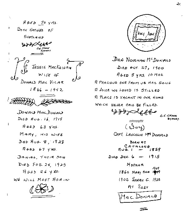 Much help in obtaining the maiden names of women buried here was given by Margaret Bishop, Flo MacMillan, Florence MacIntyre, and the late Christine Cameron. Mrs Alex (Minnie) Hunt also gave useful information.