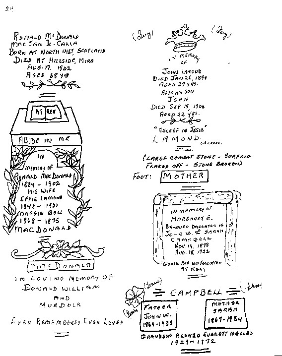This small cemetery is located on private property, Trout Brook, on the opposite shore to Oakfield. It is well kept and has recently been re-fenced. It is no longer in use. The earliest MacLeod burial is 1860; the most recent 1948. The MacLeods are "Big Donnie's" people (former M.L.A.).