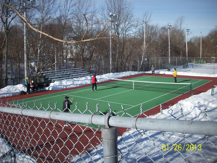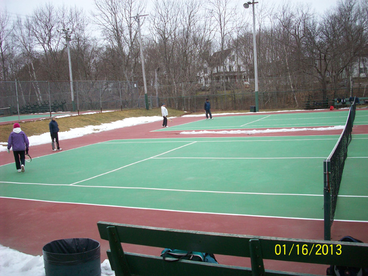 Courts 1 and 2 in play today with 7 players; Courts 3 and 4 clear of snow.