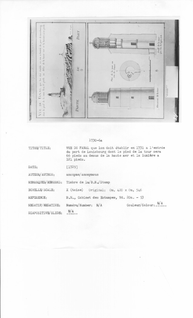VUE DU FANAL que lon doit etablir en .1731. a lentrée du port de Louisbourg dont le pied de la tour sera .66. pieds au desus de la haute mer et la lumiere a .121. pieds