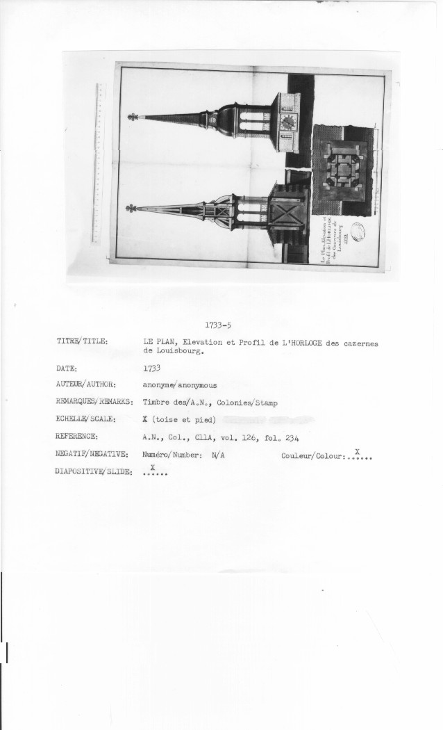 Le Plan, Elevation et Profil de L'HORLOGE des cazernes de Louisbourg 1733