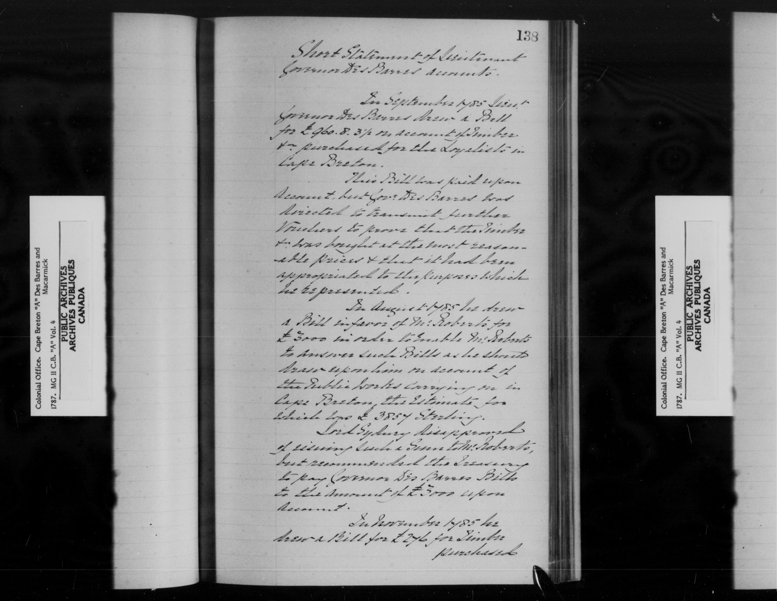 Nova Scotia and Cape Breton, Original Correspondence (CO 217), Colonial Office, Cape Breton "A", Macarmick, 1787, M.G. 11, C.B., Vol. 4, c.1787-c.1790, pp. 138-139