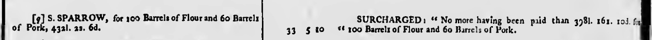 [q] S. SPARROW, for 100 Barrels of Flour and 60 Barrels of Pork, 432£. 2s. 6d. SURCHARGED: " No more having been paid than 398£ 16s. 10d. for 33 s :0 "100 Barrels of Flour and 60 Barrels of Pork. ... VOUCHERS ... [q] A. VIII. 18* ...