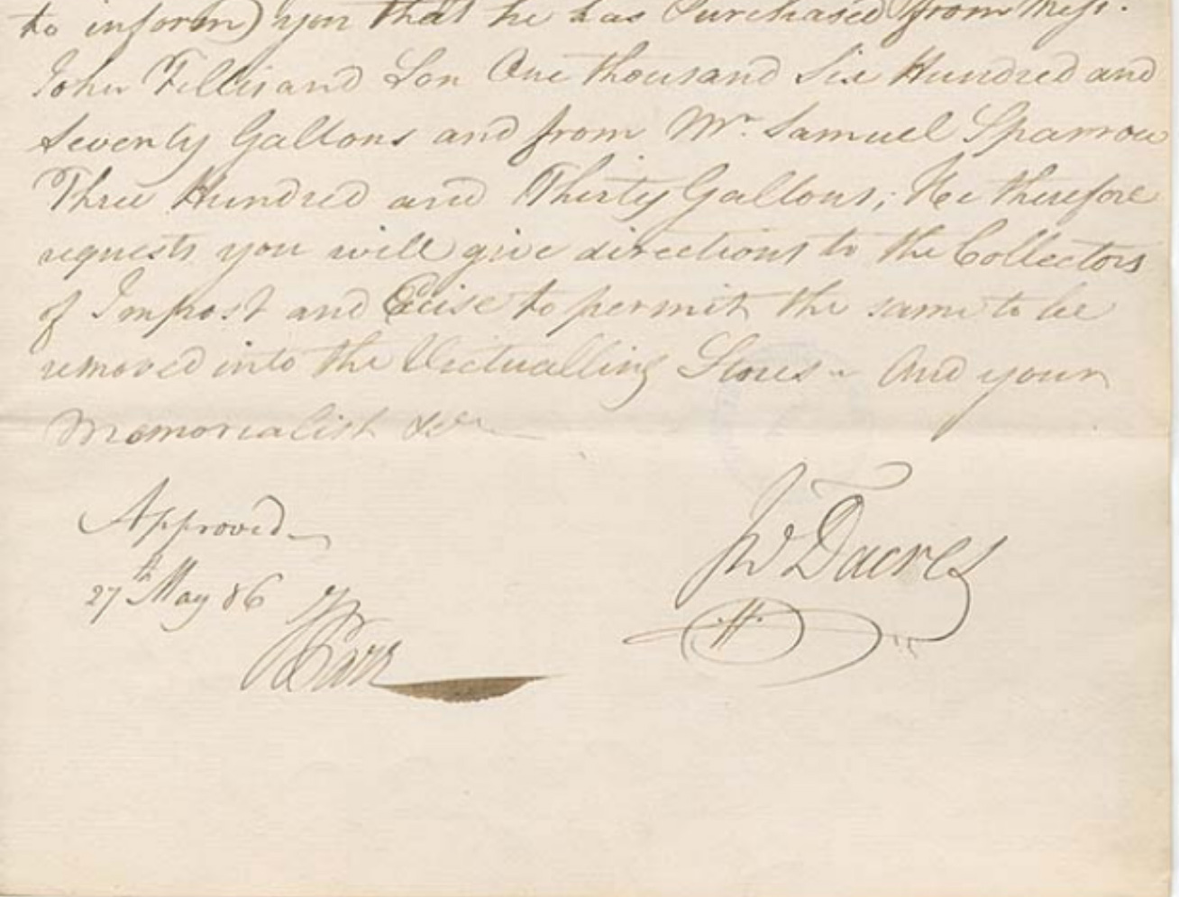 To His Excellency John Parr ...The Memorial of John Dacres Agent for Victualling His Majesty's Ships ...That in consequence of a Licence granted to your Memorialist for the purchase of Two Thousand Gallons of Rum for the Use of His Majesty's Squadron on this Station and the Carrening Yard Your Memorialist begs leave to inform you that he has Purchased from Messr. John Filliand Son One thousand Six Hundred and Seven gallons and from Mr. Samuel Sparrow Three Hundred and Thirty Gallons. We therefore request you will give directions to the Collectors of Import and Excise to permit the same to be moved into the Victualling Stores ...Approved 27 May 86 Parr ... Jn Dacres ...