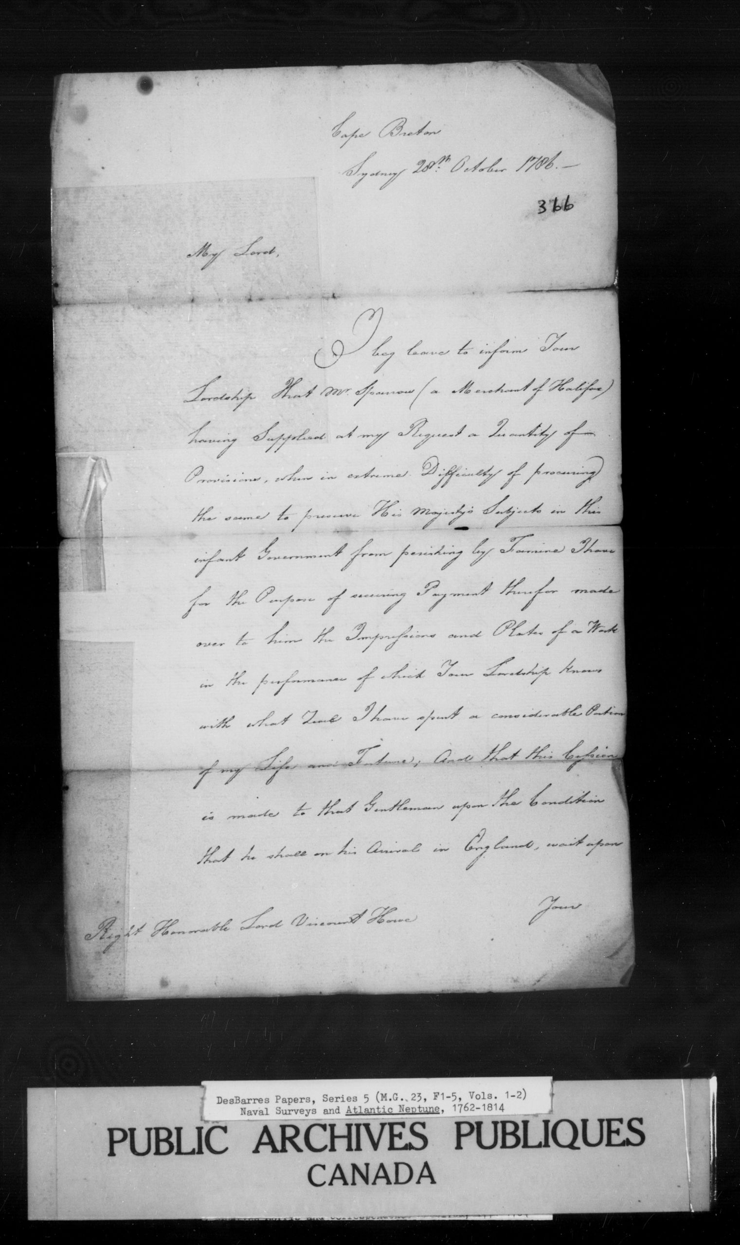 I beg leave to inform Your Lordship that Mr. Sparrow (a merchant of Halifax) having Supplied at my Request a Quantity of Provisions, when in extreme Difficulty of procuring) the same to preserve His Majesty's Subjects in this infant Government from perishing by Famine. I have for the Purpose of securing Payment therefore made over to him the Impressions and Plates of a Work in the performance of which Your Lordship knows with what Time I have spent a considerable Portion of my Life and Fortune, And that this [Cassion?] is made to that Gentleman upon the Condition that he shall on his arrival wait upon your