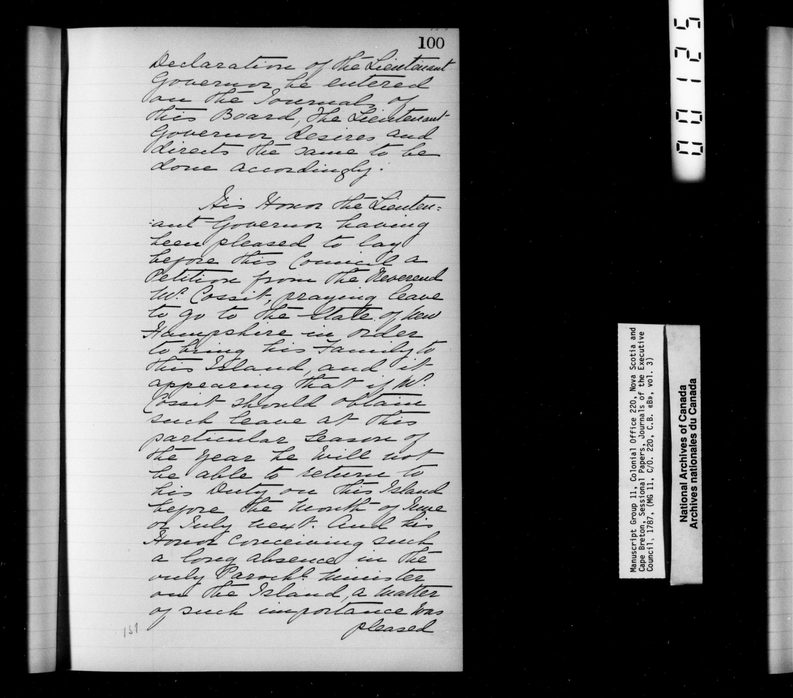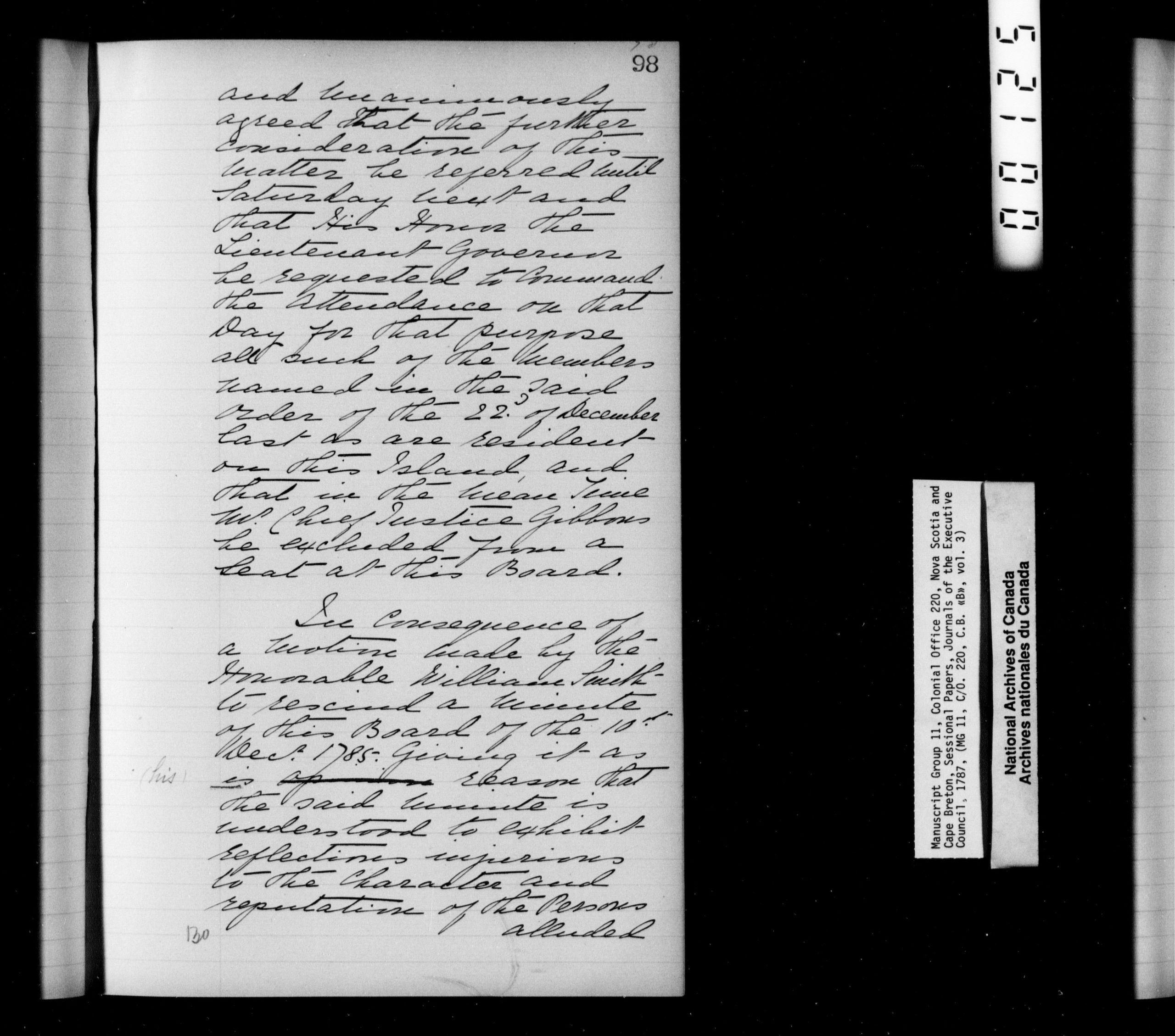 Manuscript Group 11, Colonial Office 220, Nova Scotia and Cape Breton Sessional Papers, Minutes of Executive Council, 1787 (M.G. 11, C.O. 220, C.B. "B", Vol. 3 ff. 97-101