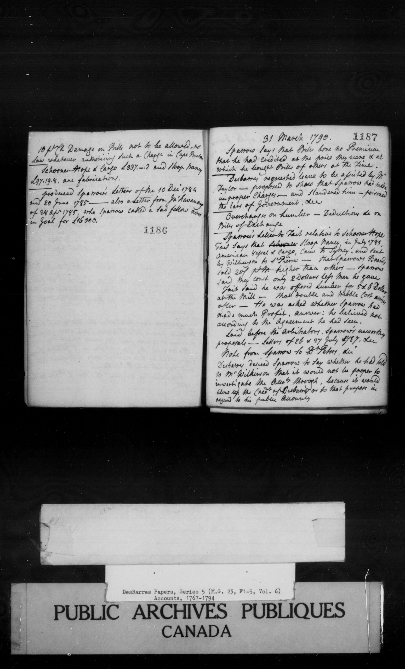 [Source: DesBarres Papers, Series 5, M23, F 1-5, Volume 6, Accounts, 1767-1794, March 31, 1790, pp. 1187-1188]