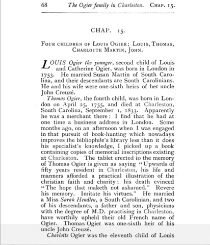 .5 Sarah Hendlen b: 1779 in John Island, Colleton Co., SC d: 22 August 1849 in Charles Town, SC ..........................................+Thomas Ogier, Esq. b: 25 April 1755 in London, Eng. m: 31 October 1804 in Charleston,SC d: 08 September 1833 in Pendleton