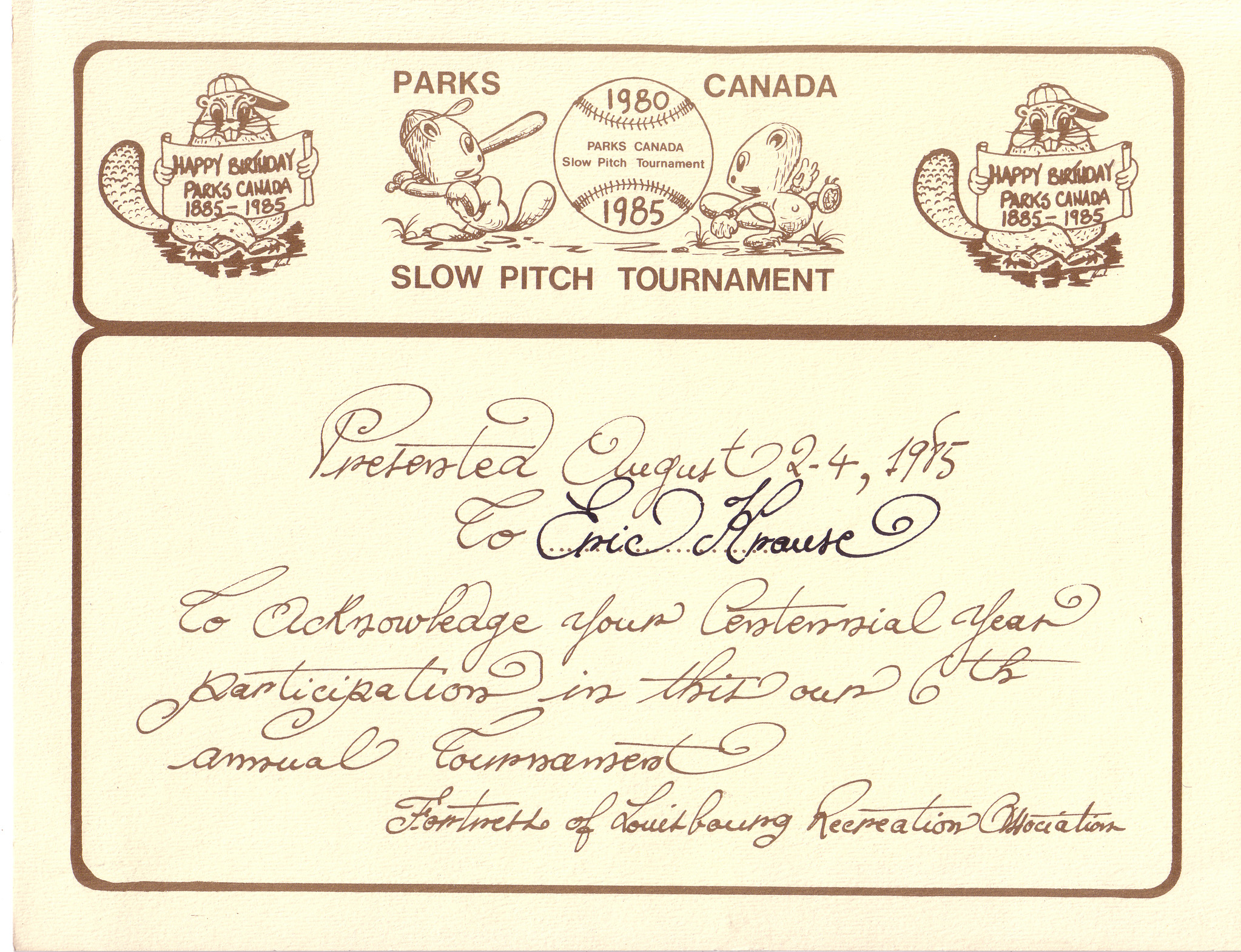 1980: First all Parks Canada Tournament - each civic holiday weekend in August - under the leadership of the Fortress of Louisbourg Recreation Association (Eric Krause, FLRA Chairman - Society Registered: 1980-06-06. Society Defaulted: 1996-06-30)