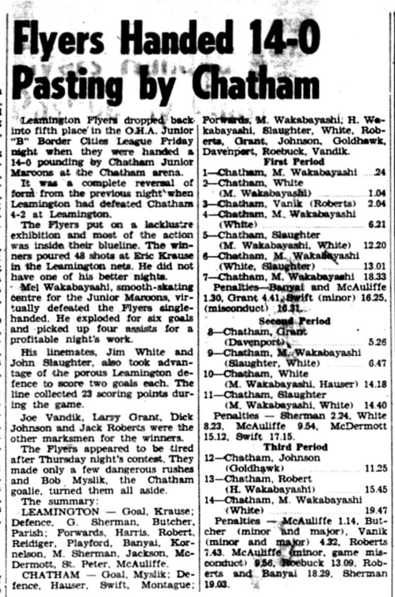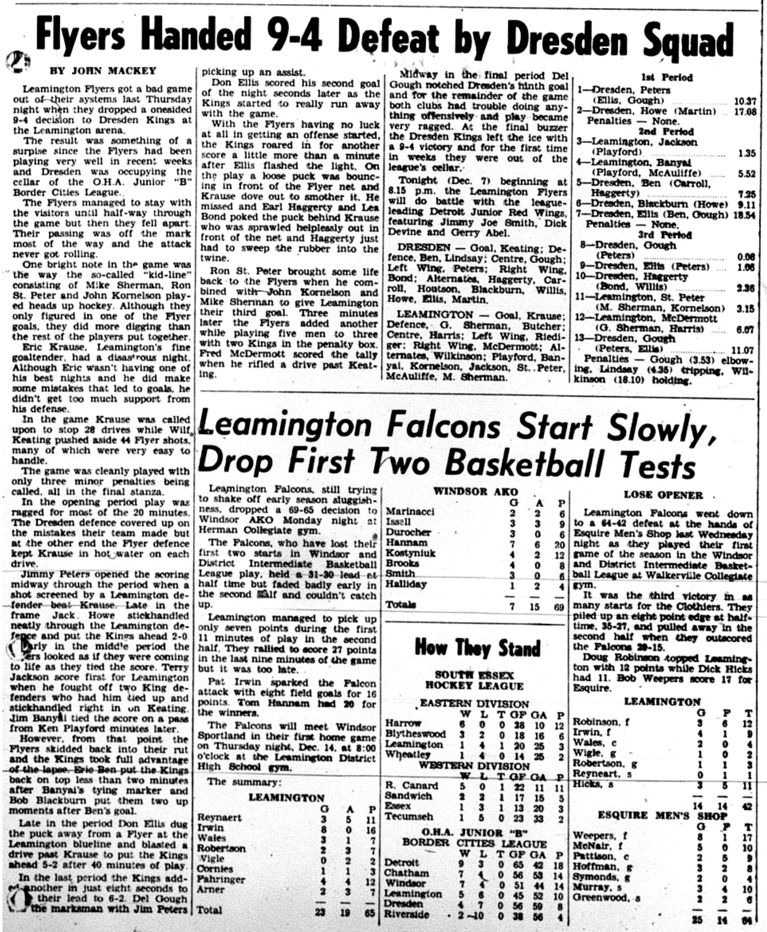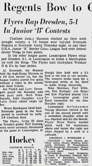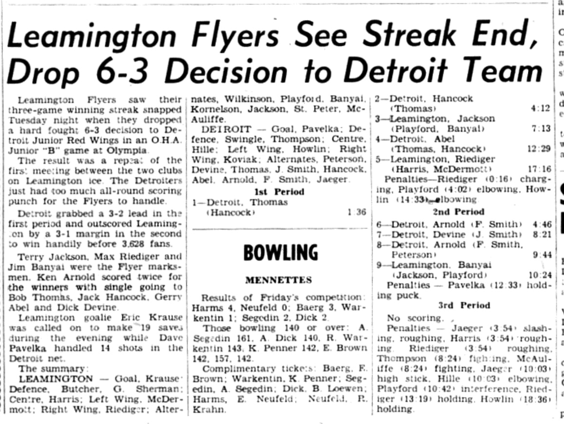"Continuing to keep in shape while awaiting the outcome of the Detroit-Dresden series, the Flyers will meet the high-scoring Wallaceburg Juveniles in an exhibition game at the Leamington arena (Feb. 22) at 8:15 p.m ..."