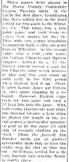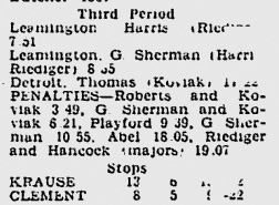 "However the boys gave a good account of themselves before the 400 hometown fans as they proved that this is one of the best teams to wear the Flyer sweaters ... The game was wide open featuring a lot of loose play, penalties, and fine goaltending. Eric Krause, rookie goaltender for the flyers, played an excellent game between the pipes and kept the flyers in the game on many occasions .... shot hit Krause on the pads and bounced high in the air. The puck landed behind Eric and before he could grab it, it skidded into the goal ... However, moments later , Eric Krause spoiled a near perfect night in the nets for himself when he let Larry Davenport's lazy drive from twenty feet out dribble in ... On the play, Davenport was in front of of the net covered by a Flyer defense man with a Maroon cruising in on the left side. Instead of passing to the onrushing forward Davenport chose to shoot and although the shot was weak, Krause was fooled completely ....In the game ... Krause at the other end blocked 27 ..."