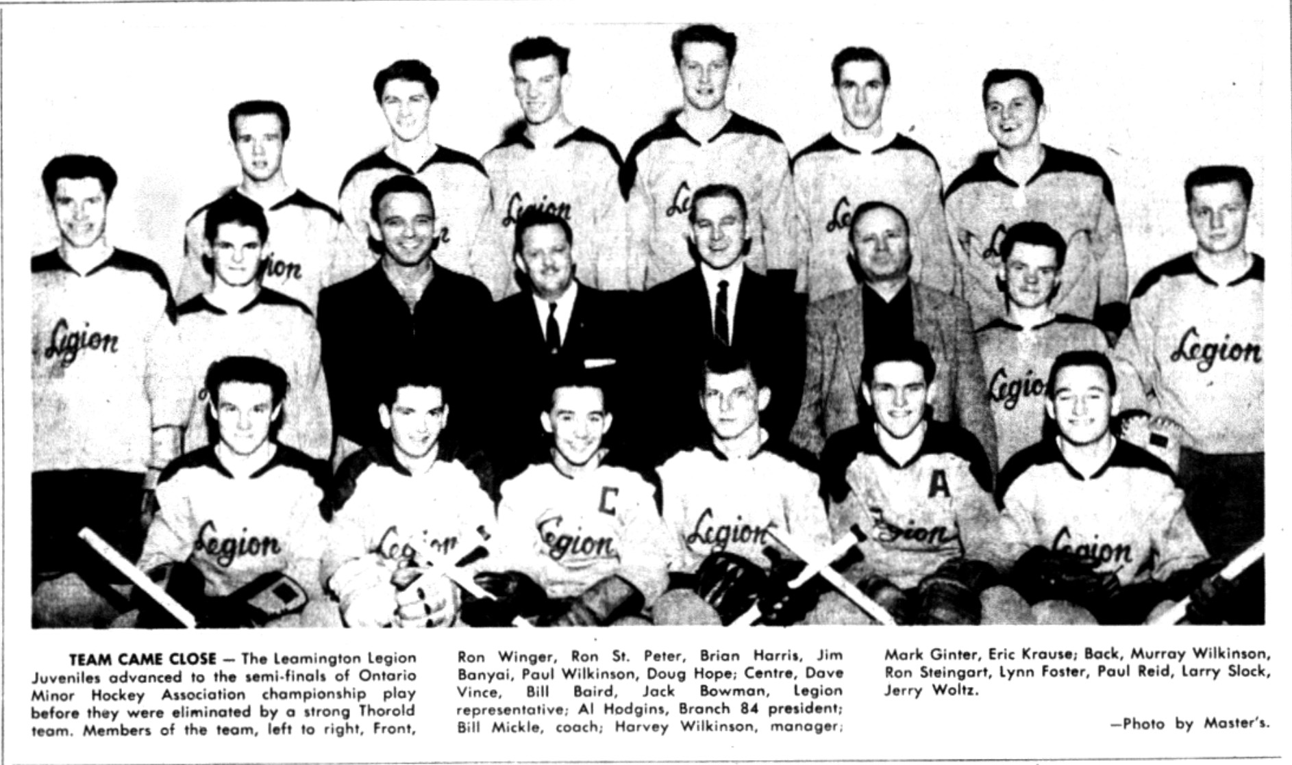 Leamington Flyers 1961/62 Fred Epplett (GM), Eric McKenzie (coach), Bob Fox (trainer), Bob Derbyshire (trainer), Paul Reid (goal), Dave Ainslie, Jim Banyai, Jim Butcher, Tim Dobson, Don Haggith, Brian Harris, Doug Hope, Terry Jackson, ?? Jolly, John Kornelson, Eric Krause [Goal], T. Krause [sic: Error], Wayne MacLean, Jim McAuliffe, Fred McDermott, Bob McKeen, Bob McLean, Ken Playford “C”, Dave Prpich, Max Riediger, Don Robert, George Sherman, Mike Sherman, Ron St. Peter, Rick Thompson, Terry Wilding “C”, Paul Wilkinson, Ron Winger |
