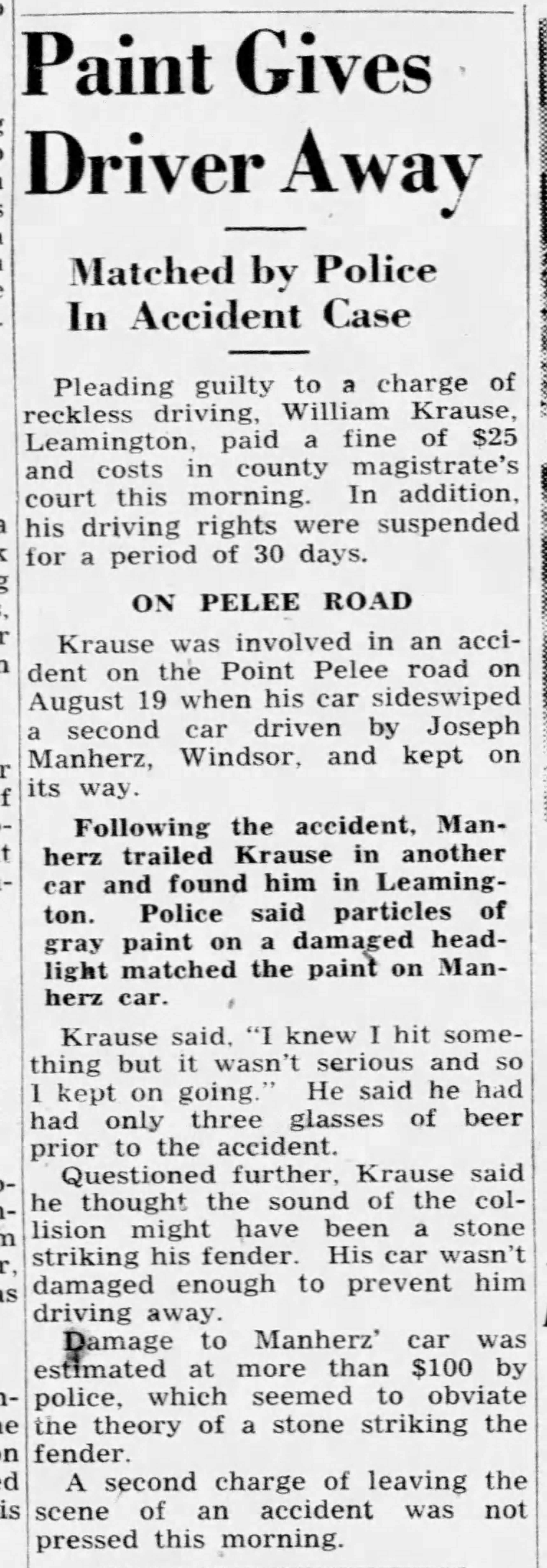 Krause was involved in an accident on the Point Pelee road on August 19 when his car sideswiped a second car driven by Joseph Manherz, Windsor, and kept on its way.
