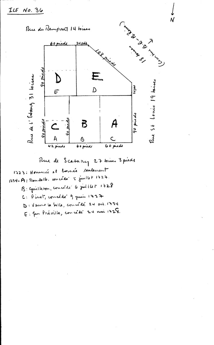 Block 36 Properties (late 1960's Bernard Pothier (A Study of Property and Town Planning) work sheet - Note: Use with care as both the 1723 and the 1734 property designations (which are often different) are used) 9368.jpg (77365 bytes)
