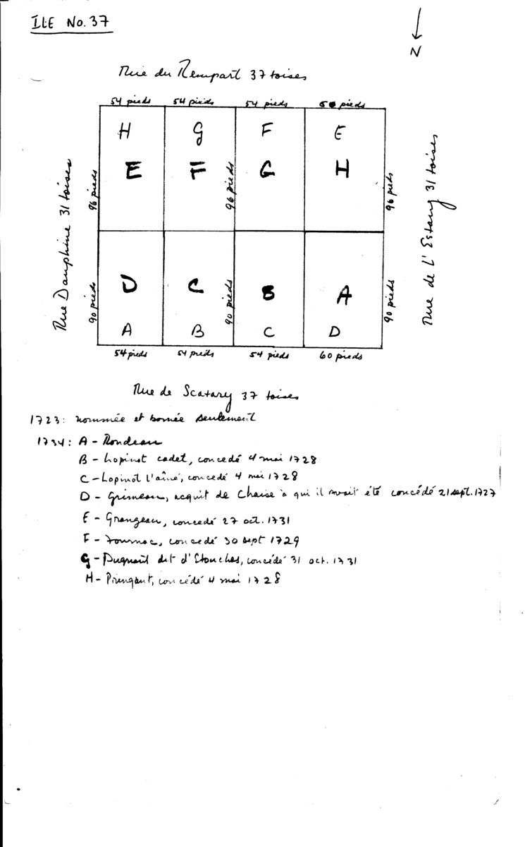 Block 37 Properties (late 1960's Bernard Pothier (A Study of Property and Town Planning) work sheet - Note: Use with care as both the 1723 and the 1734 property designations (which are often different) are used) 9376.jpg (90813 bytes)