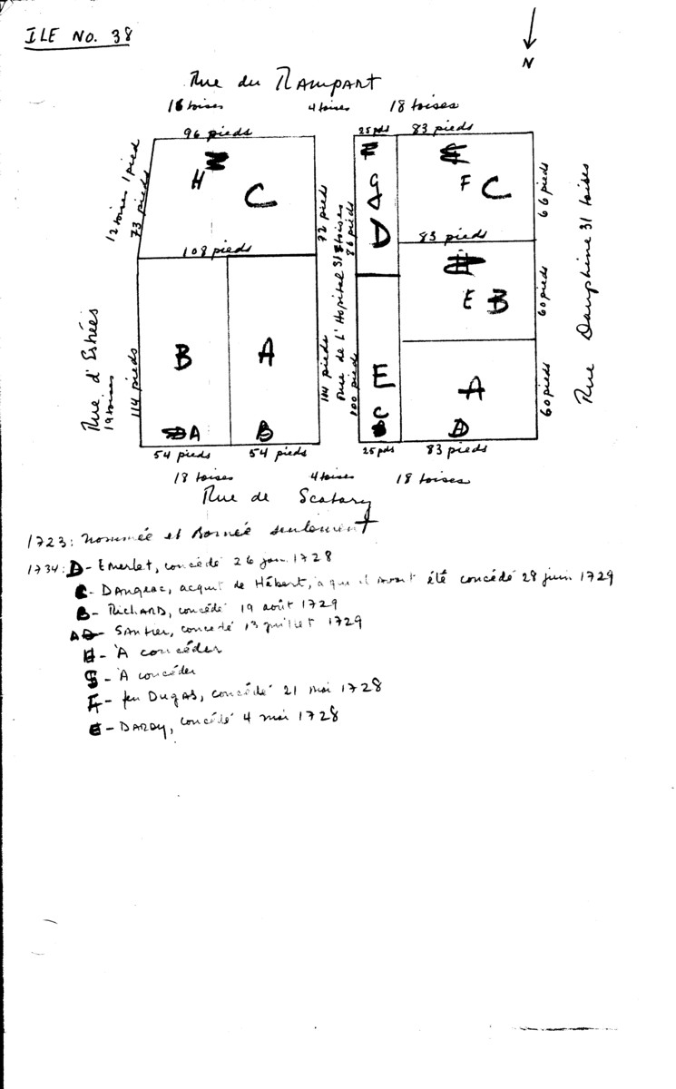 Block 38 Properties (late 1960's Bernard Pothier (A Study of Property and Town Planning) work sheet - Note: Use with care as both the 1723 and the 1734 property designations (which are often different) are used) 9387.jpg (102615 bytes)