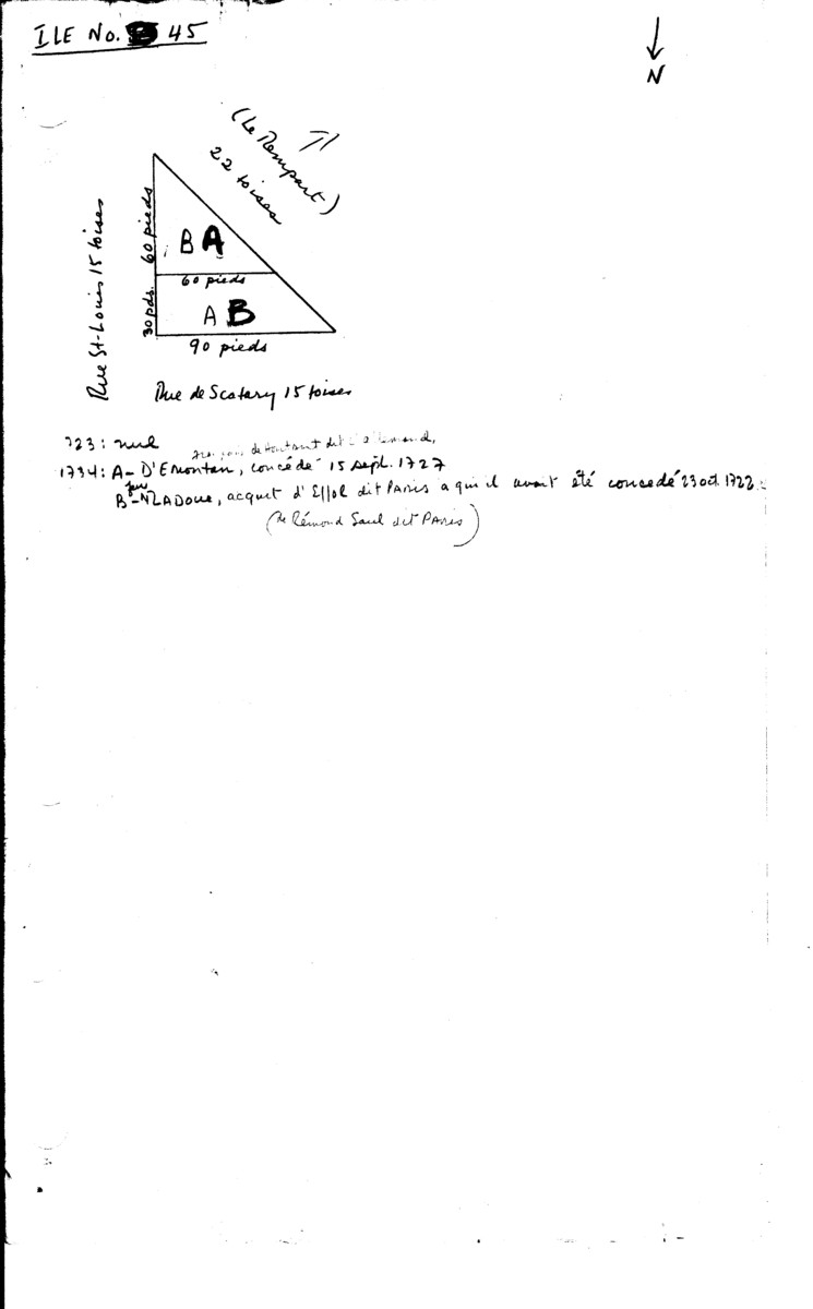 Block 45 Properties (late 1960's Bernard Pothier (A Study of Property and Town Planning) work sheet - Note: Use with care as both the 1723 and the 1734 property designations (which are often different) are used) 9417.jpg (57434 bytes)