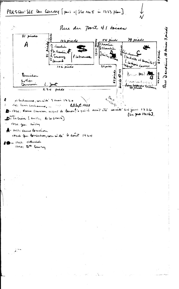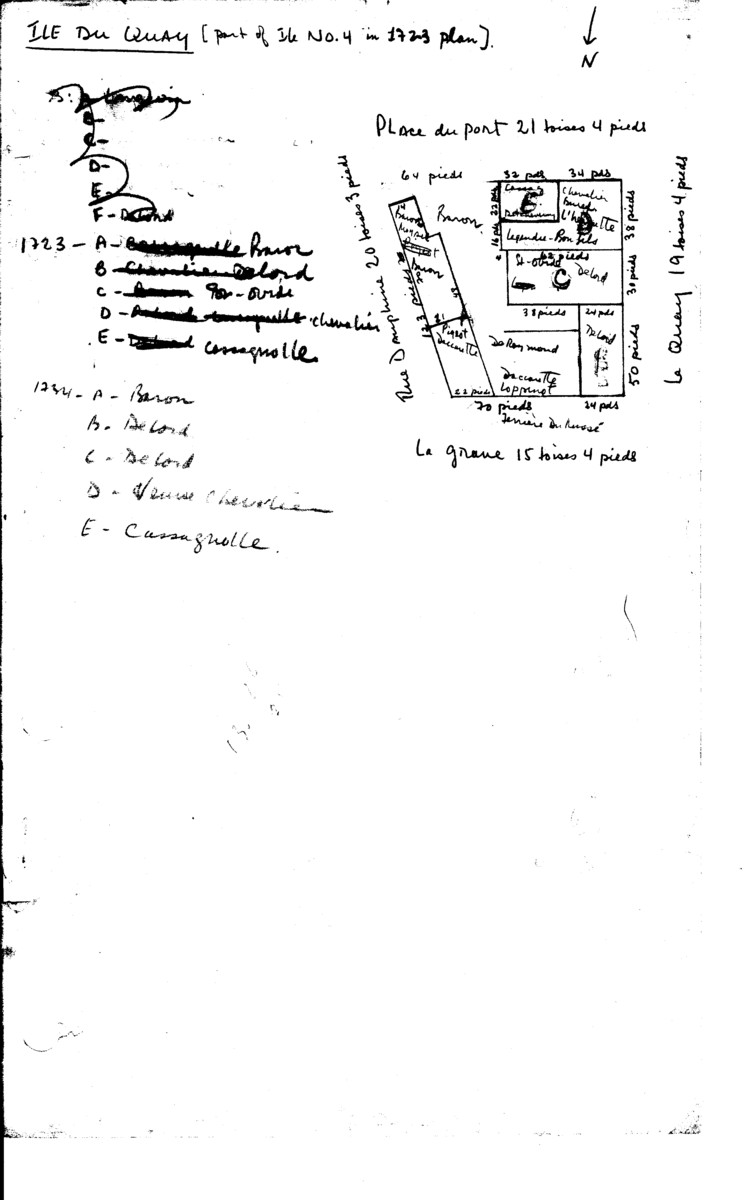 Presqu'Isle Du Quay Properties [part of Block 5 on 1723 plan] (late 1960's Bernard Pothier (A Study of Property and Town Planning) work sheet - Note: Use with care as both the 1723 and the 1734 property designations (which are often different) are used) 9546.jpg (104751 bytes) .
