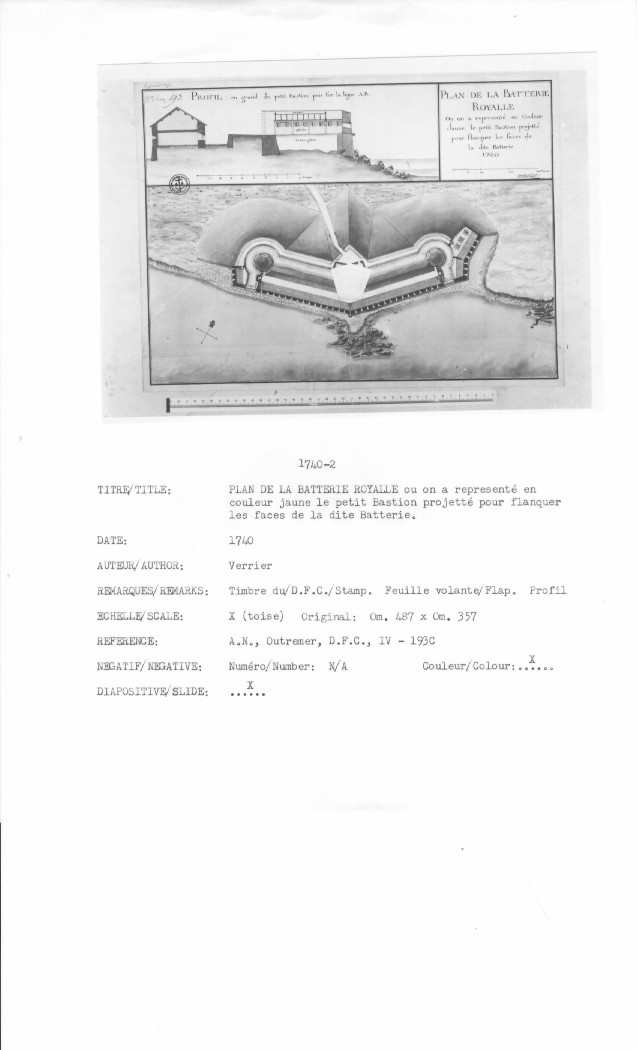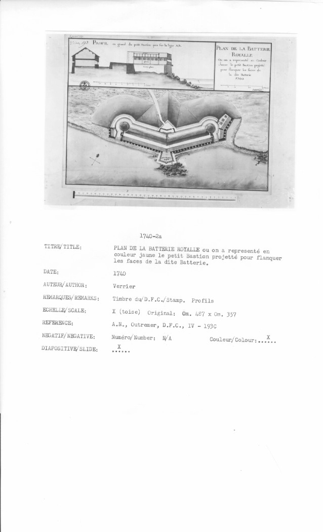 PLAN DE LA BATTERIE ROYALLE Ou on a representé en Couleur Jaune le petit Bastion projetté pour flanquer les faces de la dite Batterie 1740