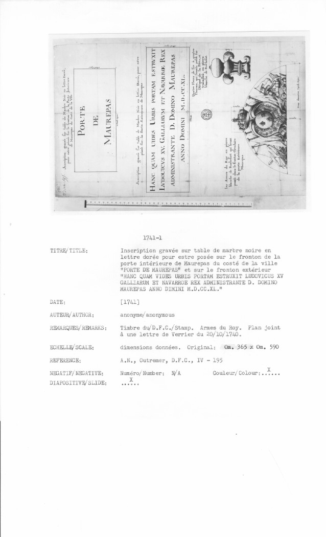 Inscription gravé sur table de Marbre Noir en lettre Dorée pour estre pôsée sur la Porte Exterieure de Maurepas HANC QUAM VIDES URBIS PORTAM ESTRVXIT LVDOVICVS XV. GALLIARVM ET NAVRROE REX ADMINISTRANTE D. DOMINO MAUREPAS ANNO DIMINI M.D.CC.XL.