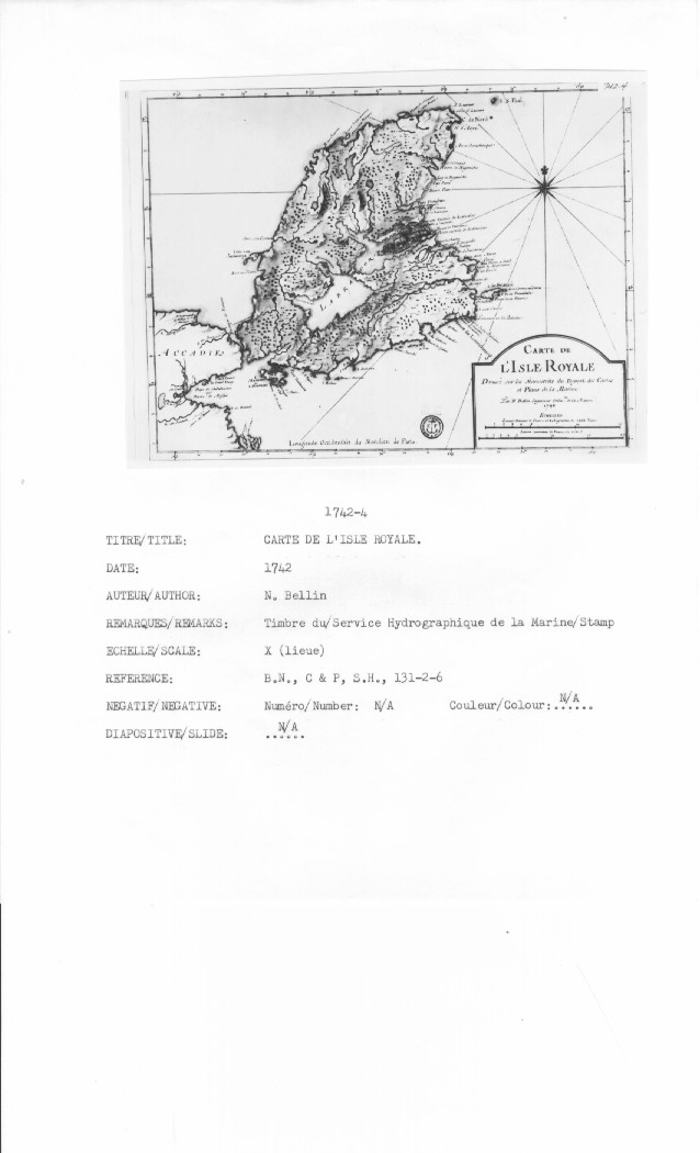 CARTE DE L'ISLE ROYALE Dressée sur les Manuscripts du Depost des Cartes et Plans de la Marine Par N. Bellin Jngenieur Ordinre. de la Marine 1742