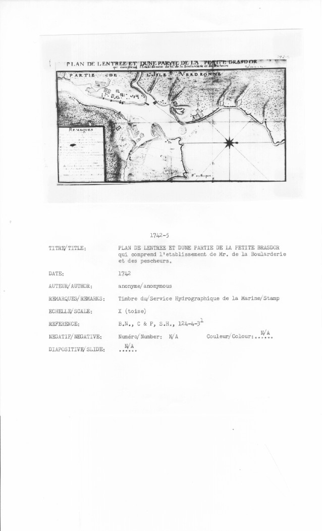 PLAN DE LENTREE ET DUNE PARTIE DE LA PETITE BRASDOR qui comprend l'Etablissement de Mr. de la Boularderie et des Pescheurs