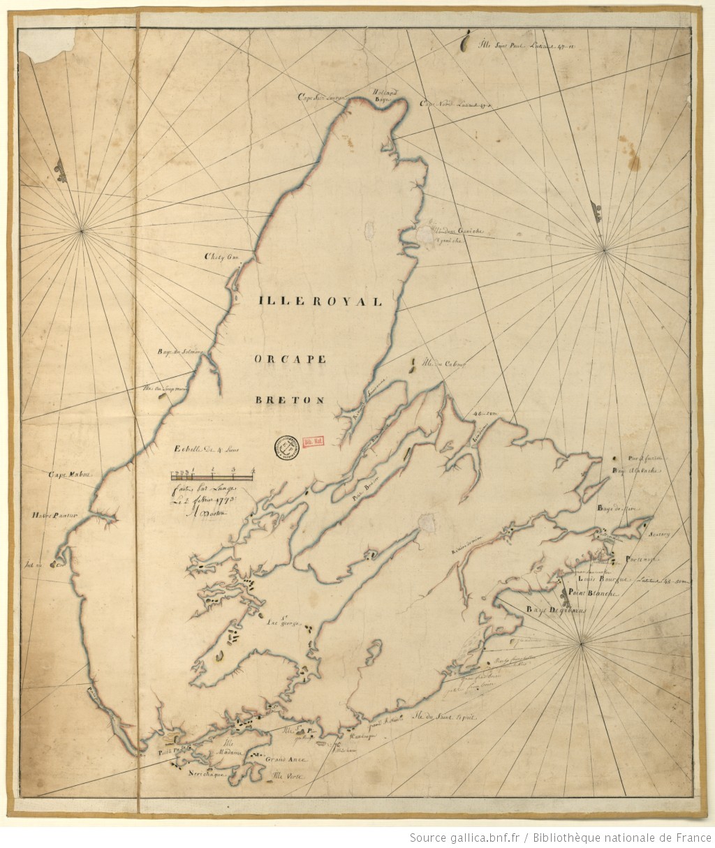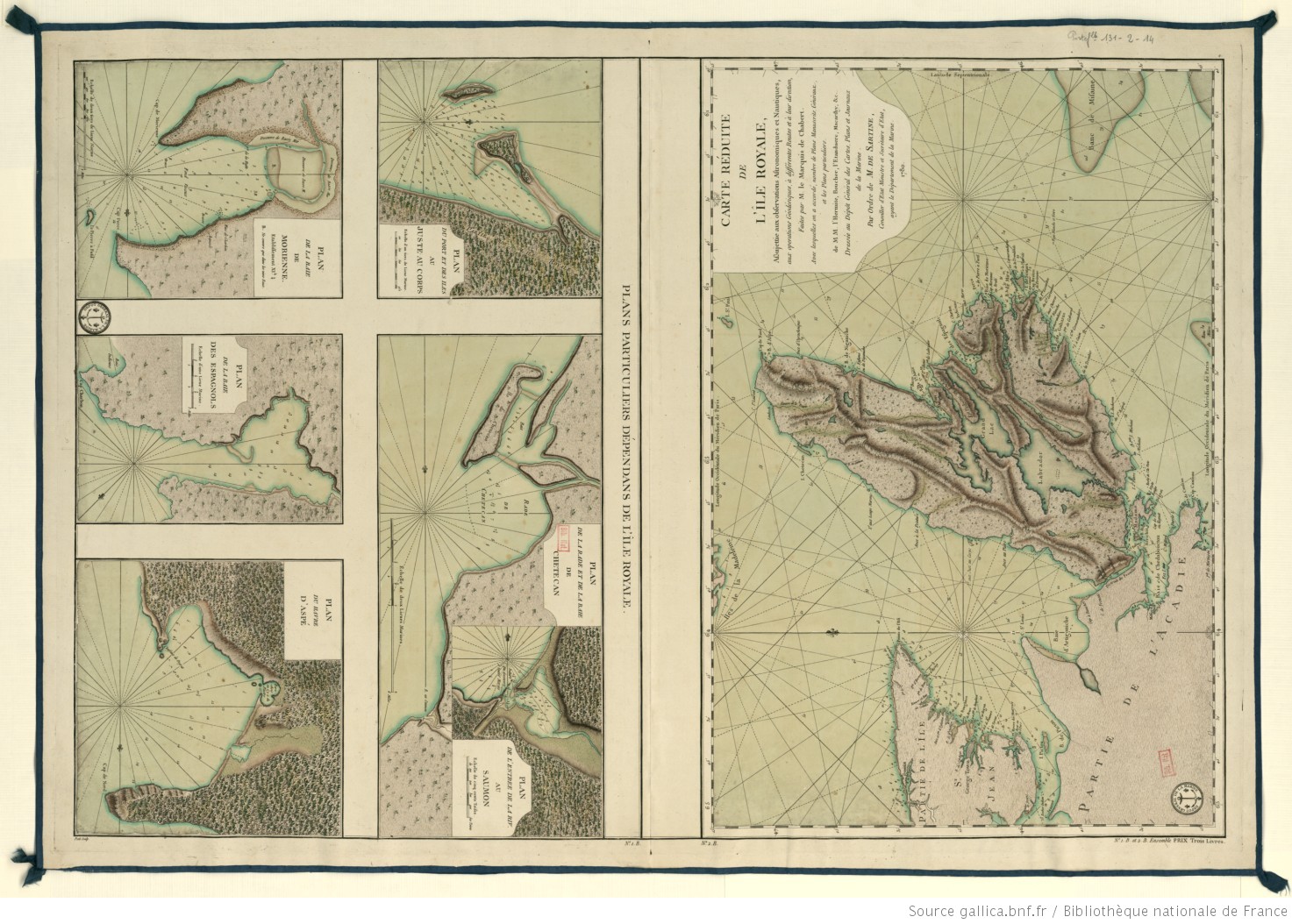 CARTE RÉDUITE DE L'ILE ROYALE Asoujettie aux observations Astronomiques et nautiques, aux operations Géodésiques, à différentes Routes et é leur direction, Faites par M. le Marquis de Chabert, Avec lesquelles on a accordé, nombre de Plans, Manuscripts Généraux, et les Plans particuliers de M.M. l'Hermitte, Boucher, l'Etanduere, Macarthy, &c., Dressé au Dépôt Général des Cartes, Plans et Journaux de la Marine, Par Ordre De M. DE SARTINE, Conseiller d'Etat, Ministre et Sécrètaire d'Etat, ayant le Département de la Marine. 1780