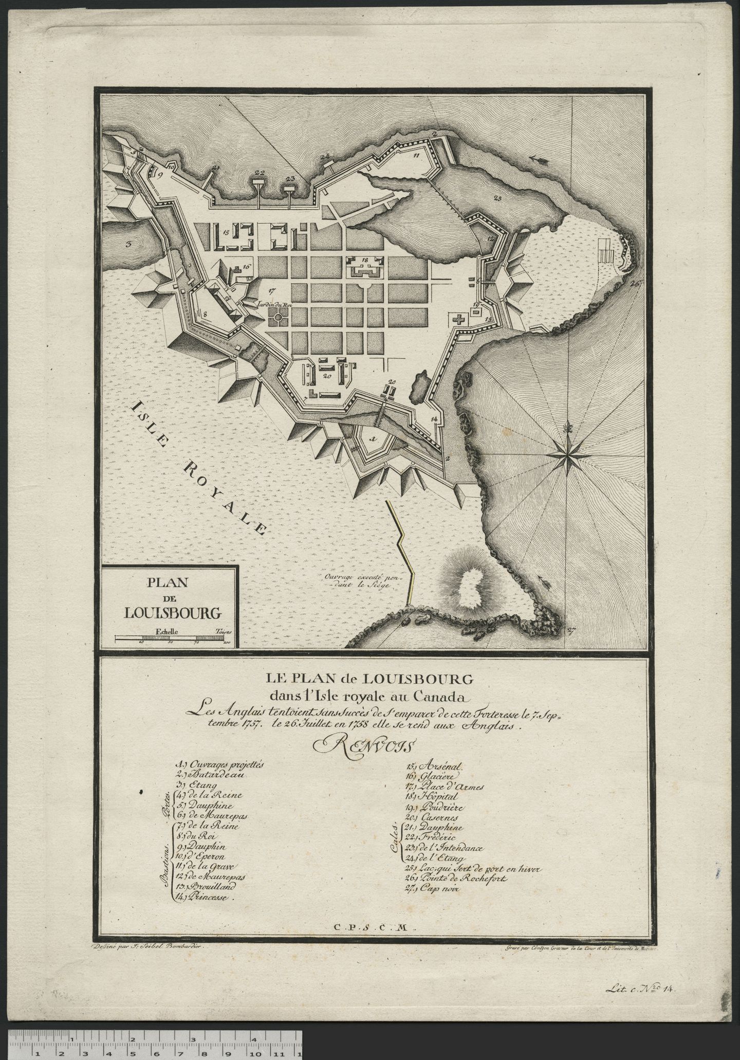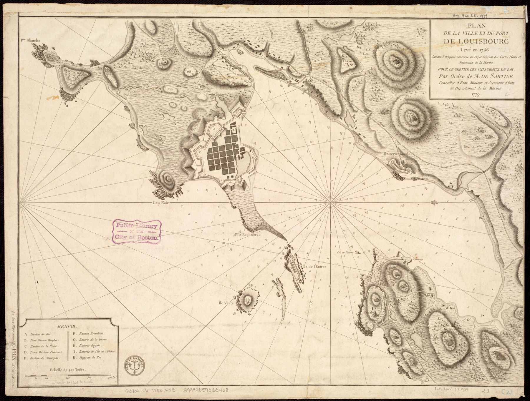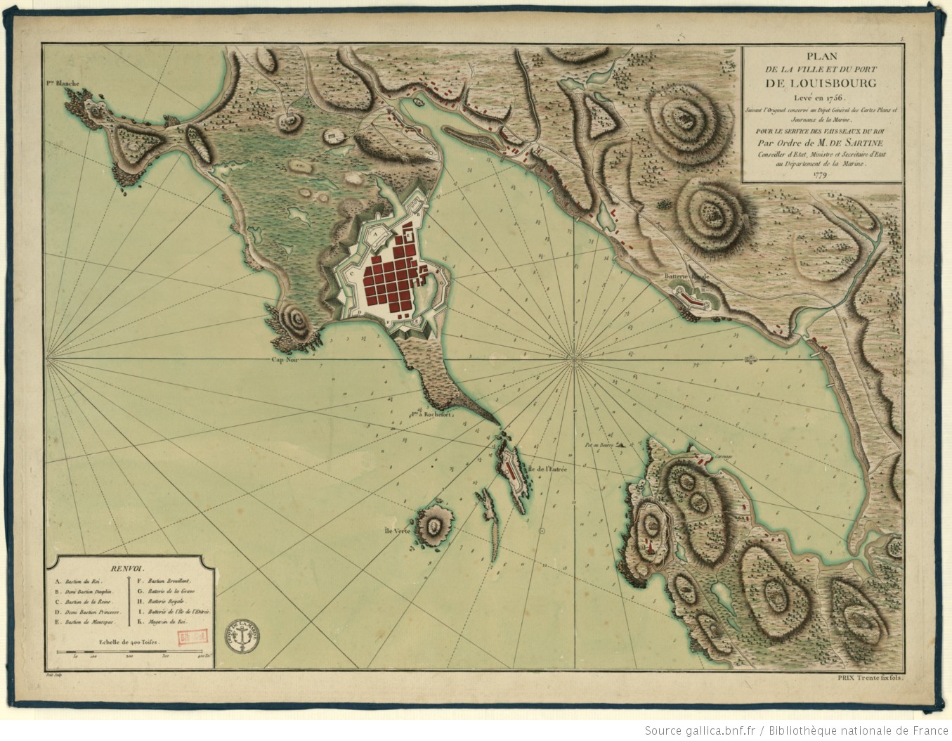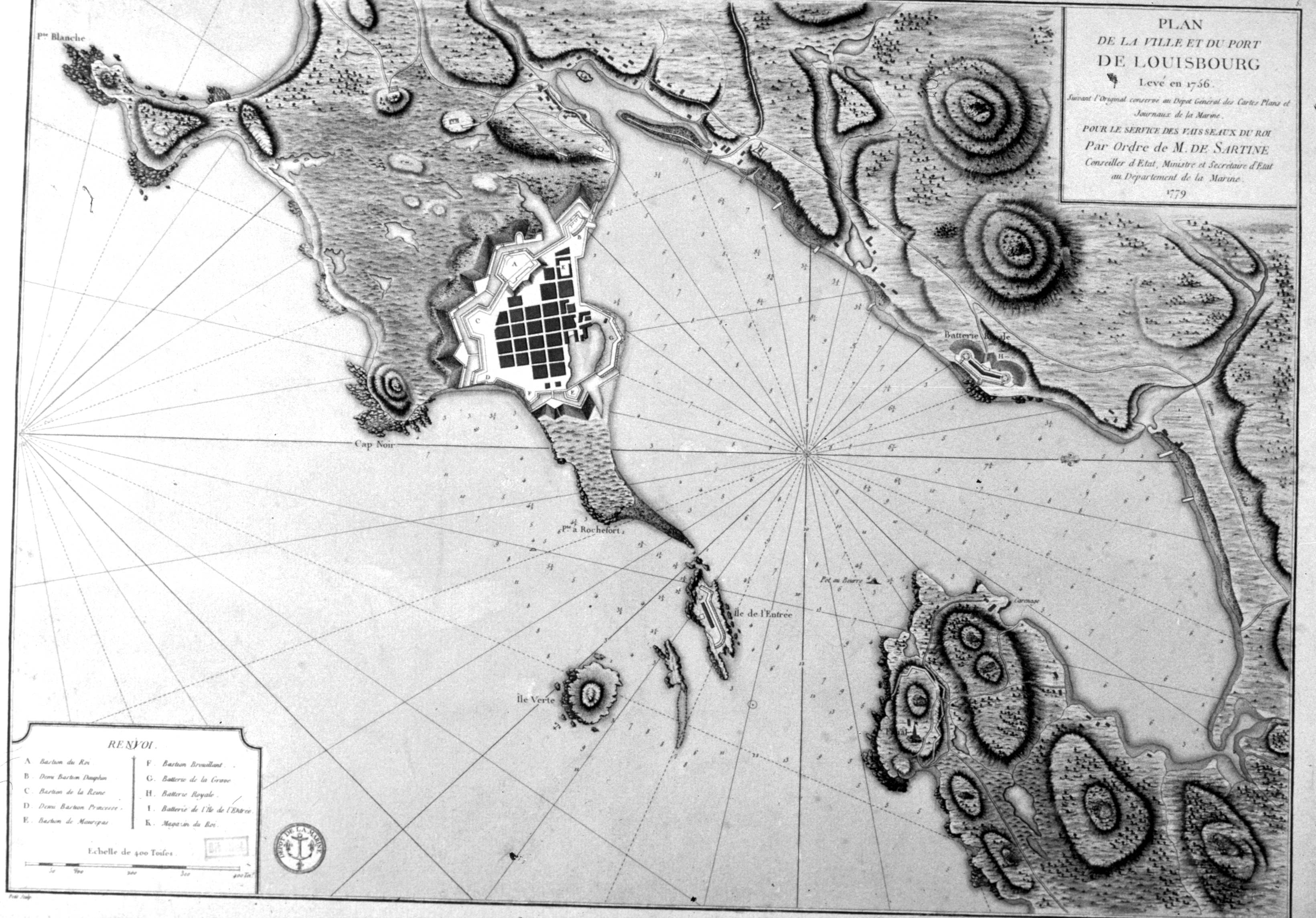 PLAN DE LA VILLE ET DU PORT DE LOUISBOURG levé en 1756. Suivant l'Original conservé au Dépôt Général des Cartes Plans et Journaux de la Marine. POUR LE SERVICE DES VAISSEAUX DU ROI Par Ordre De M. DE SARTINE, Conseiller d Etat, Ministre et Secretaire d'Etat au Département de la Marine. 1779