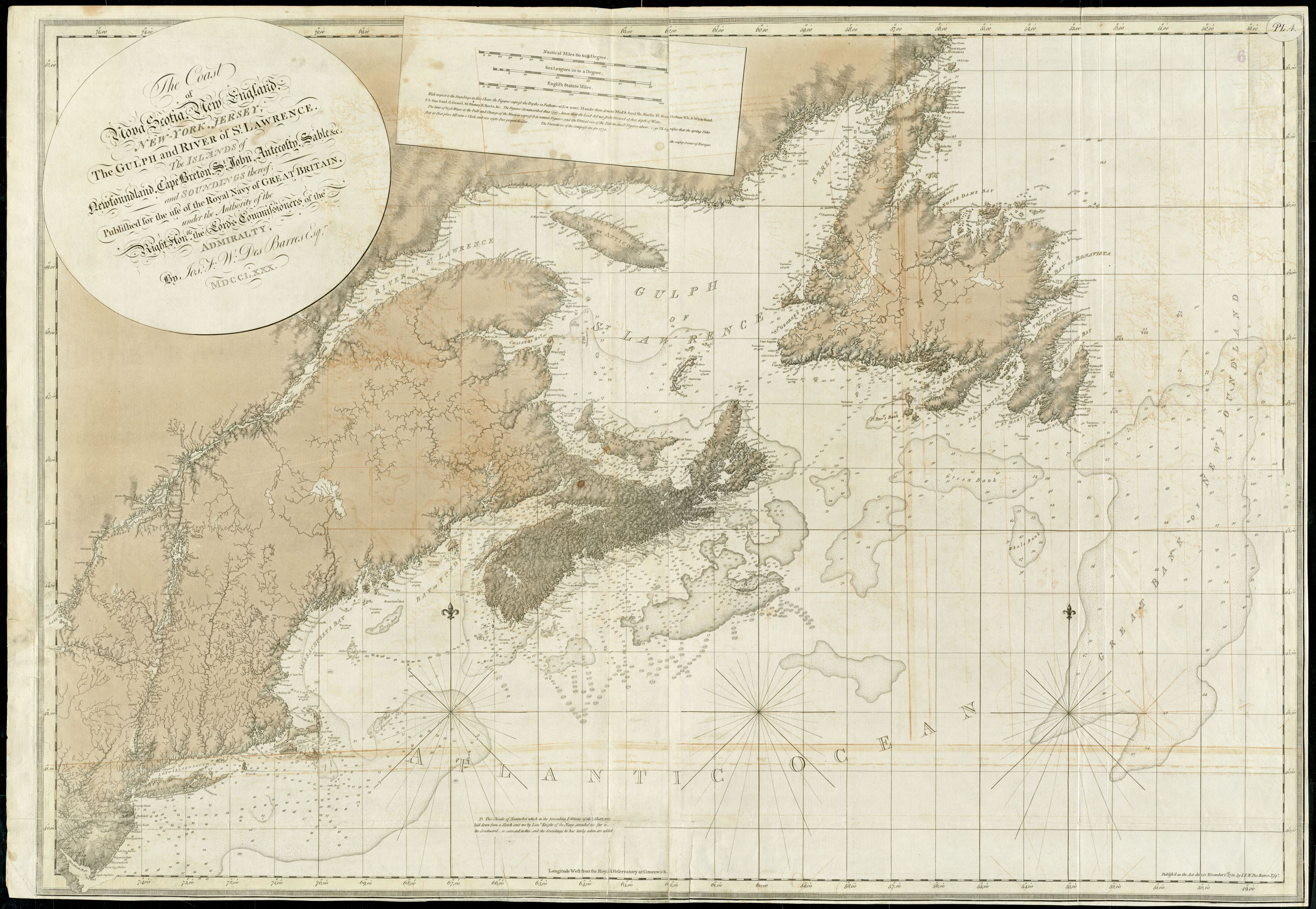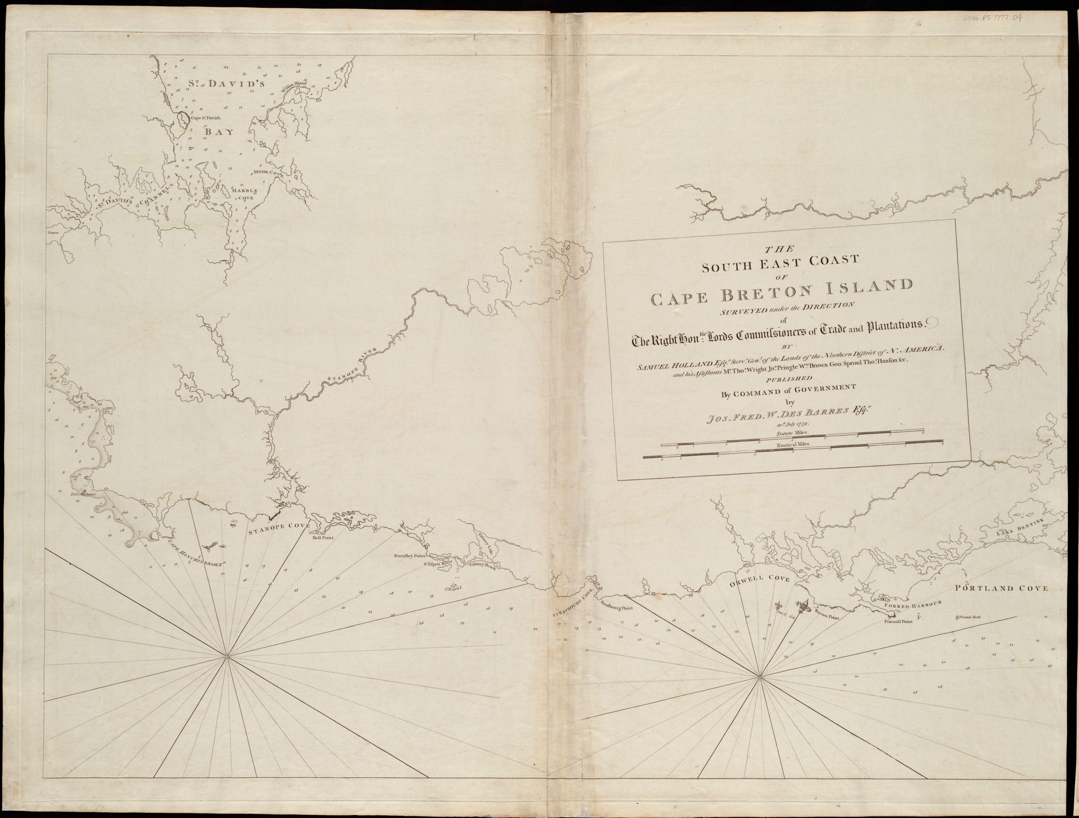 THE SOUTH EAST COAST OF CAPE BRETON ISLAND SURVEYED under the DIRECTION of The right honble. Lords Commissioners of Trade and Plantations BY SAMUEL HOLLAND Esqr., Survr. Genl. of the Lands of the Northern District of N. AMERICA, and his Assistants Mr. Thos. Wright, Jno. Pringle, Wm. Brown, Geo: Sproul, Thos. Hanson, &c. PUBLISHED BY COMMAND OF GOVERNMENT by JOS. FRED. W. DES BARRES Esqr. 30th. July 1779.