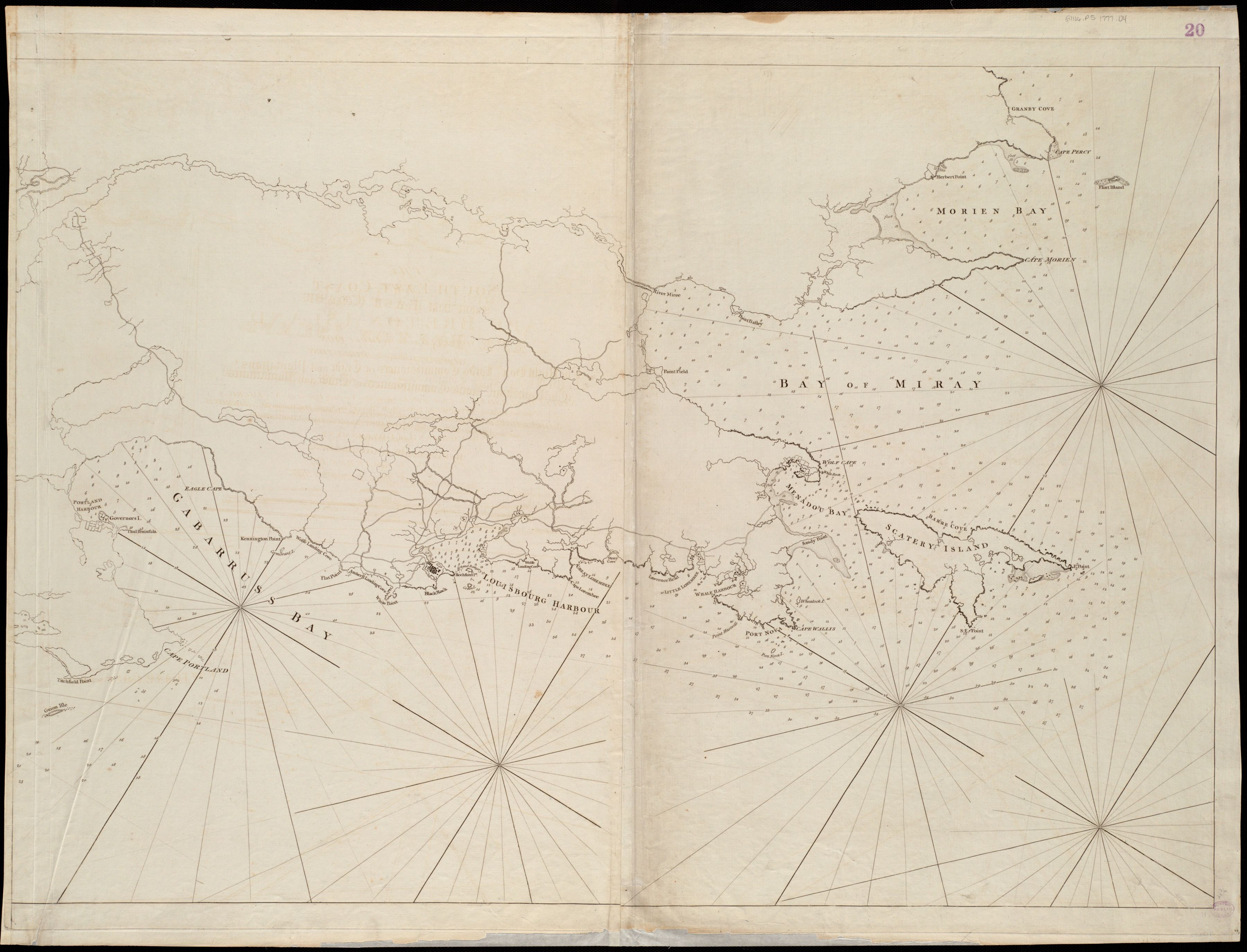 PLAN DE LA BAIE DE GABARUS SITUÉE A LA CôTE S.E. DE L'îLE ROYALE, Dressé au Dépôt Général des Cartes, Plans et Journaux de la Marine, d'après un Plan Manuscript de ce Dépôt, Asoujettie aux Triangles de M. le [Mrq?] de Chabert , Par Ordre De M. DE SARTINE, Conseiller d'Etat, Ministre et Sécrètaire d'Etat ayant le Département de la Marine. 1779