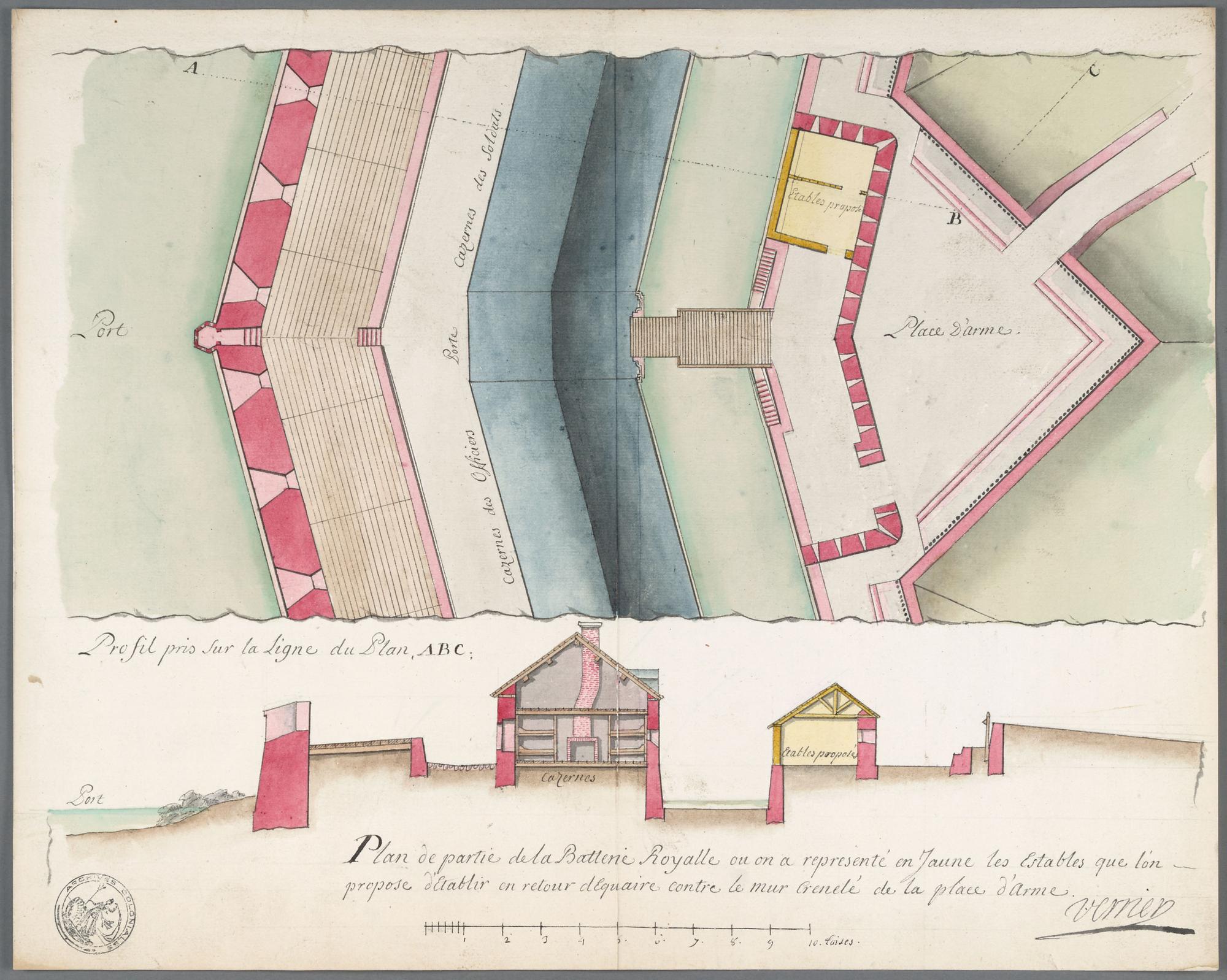 Plan de partie de la Batterie Royalle ou on a representé en Jaune les Estables que l'on propose d'Etablir en retour dEquaire contre le mur Crenelé de la place d'Arme