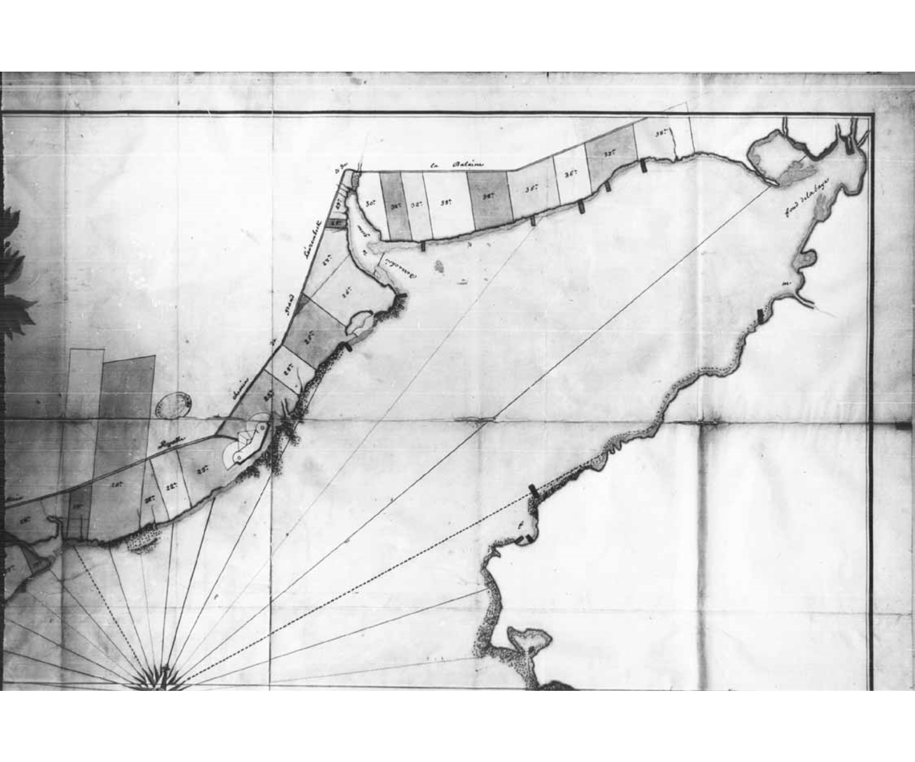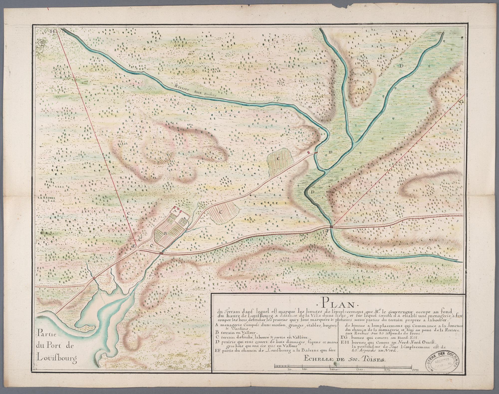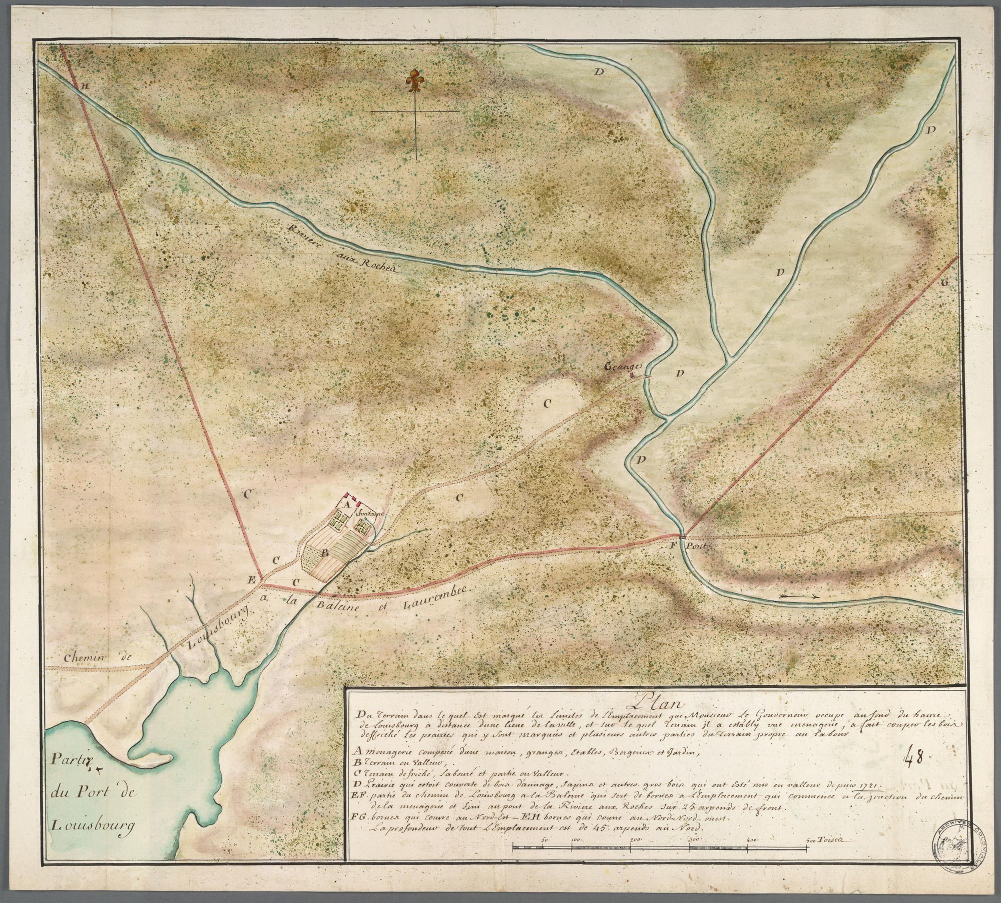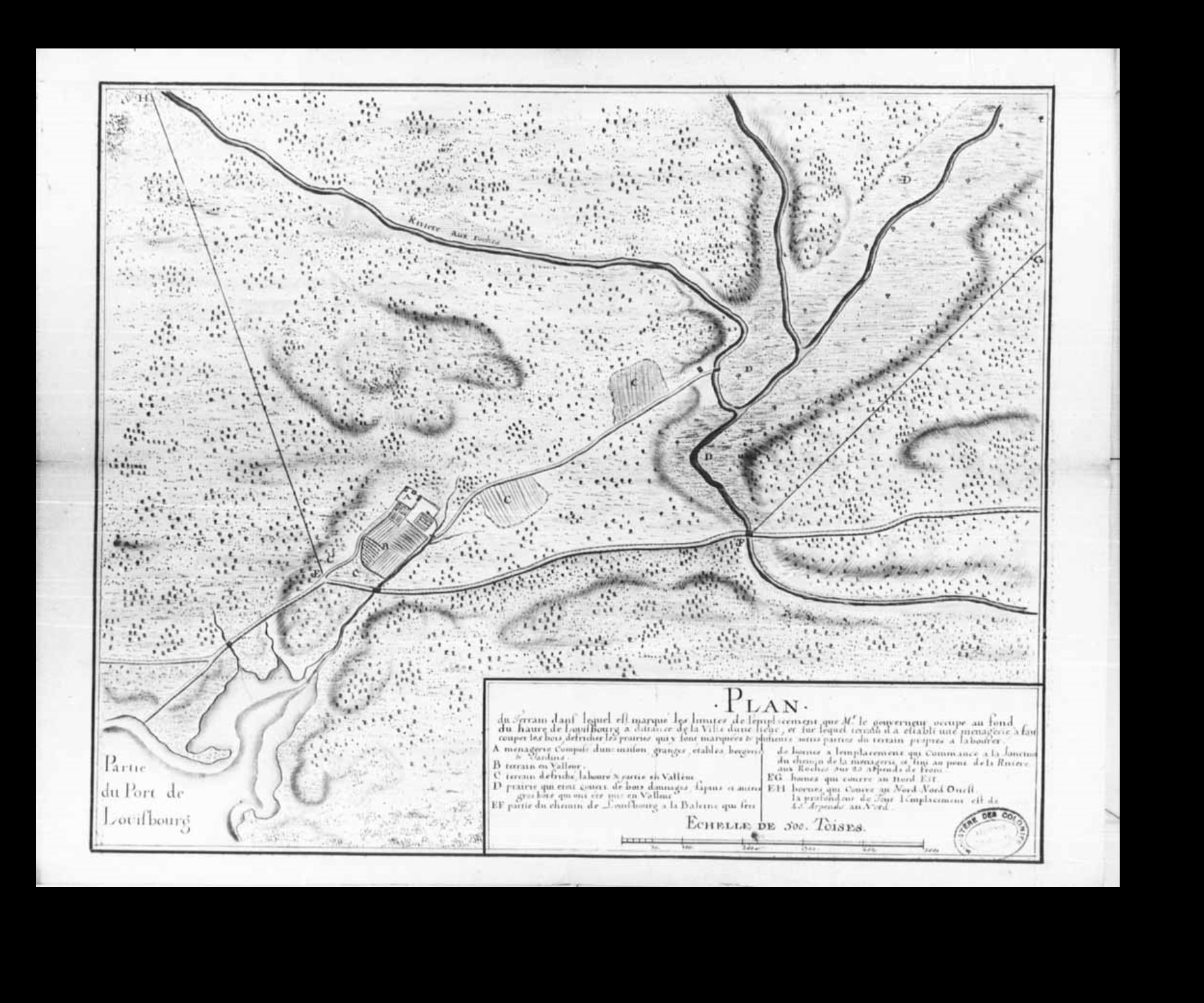 Plan Du Terrain dans le quel Est marqué les Limites de l'Emplacement que Monsieur le Gouverneur occupe au fond du havre de Louisbourg a distance d'une lieue de la ville, et sur le quel Terrain il a estably une menagerie, a fait couper les bois defriché les prairies que y Sont marquées et plusieurs autres parties du terrain propre au labour