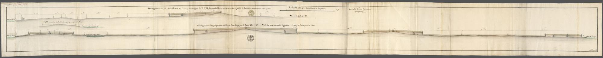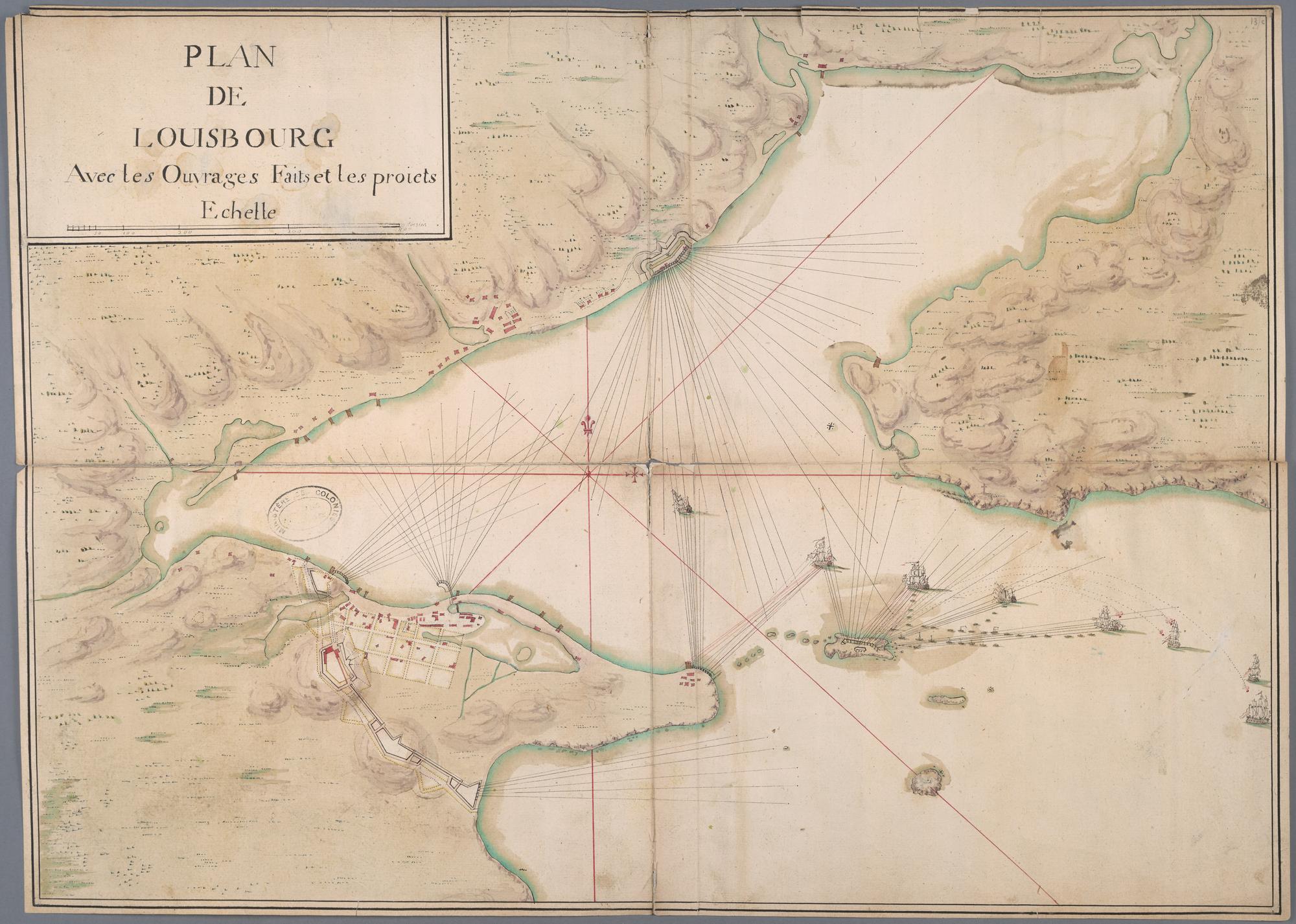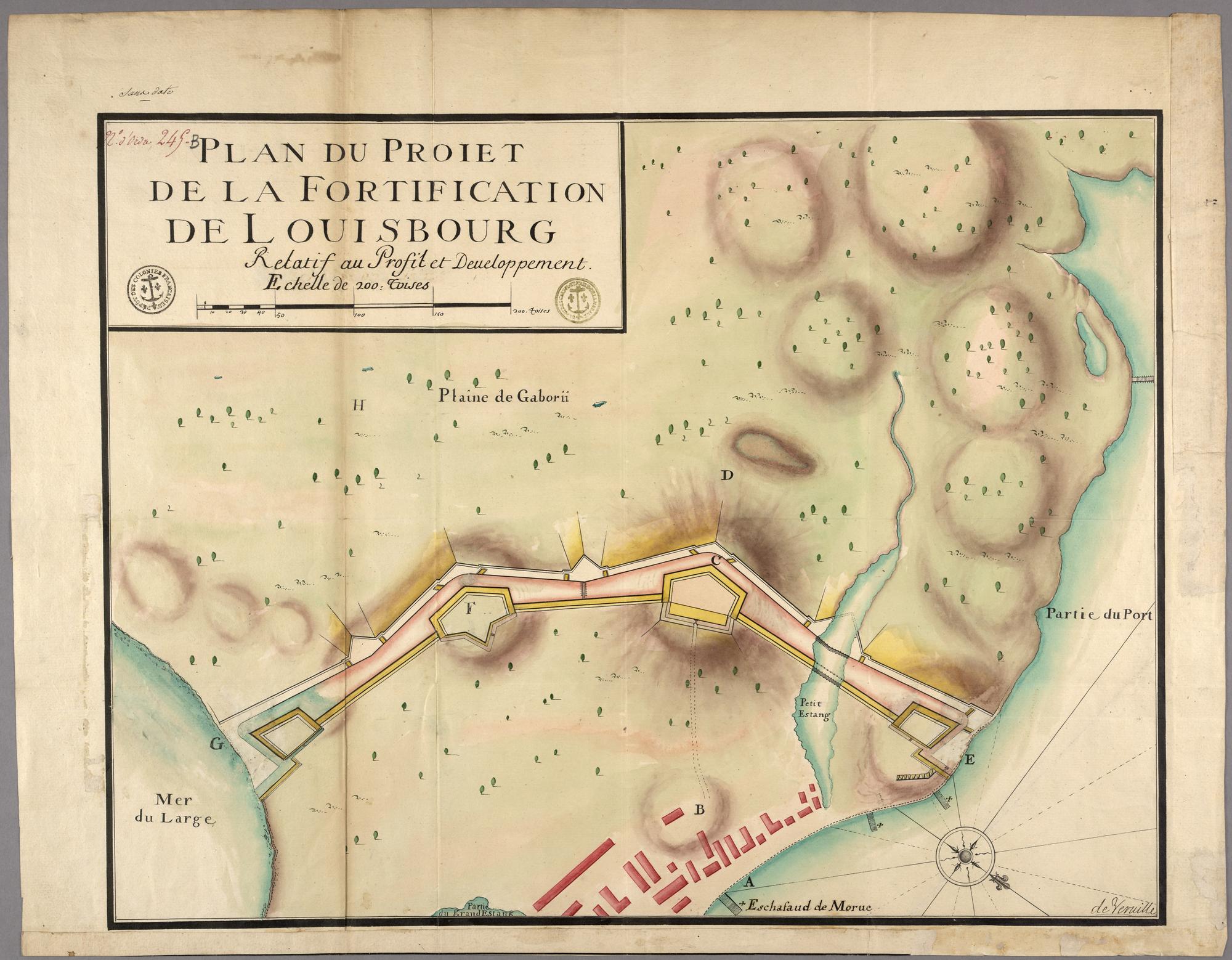 Developpement de la fortifications du Port de Louisbourg par la ligne E,C,F,G, de 504: toises de Longueur Relatif au Plan du port en Entier