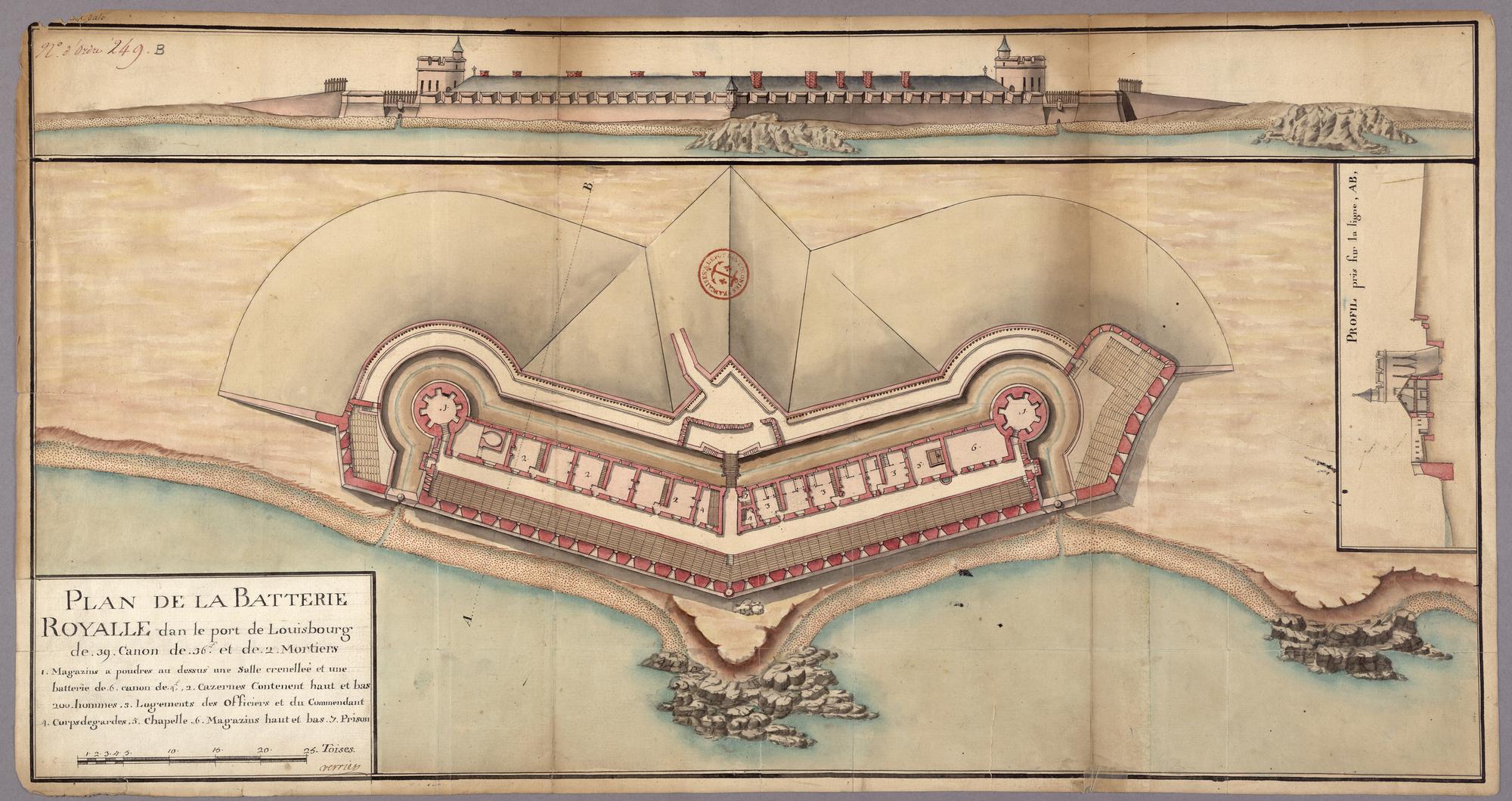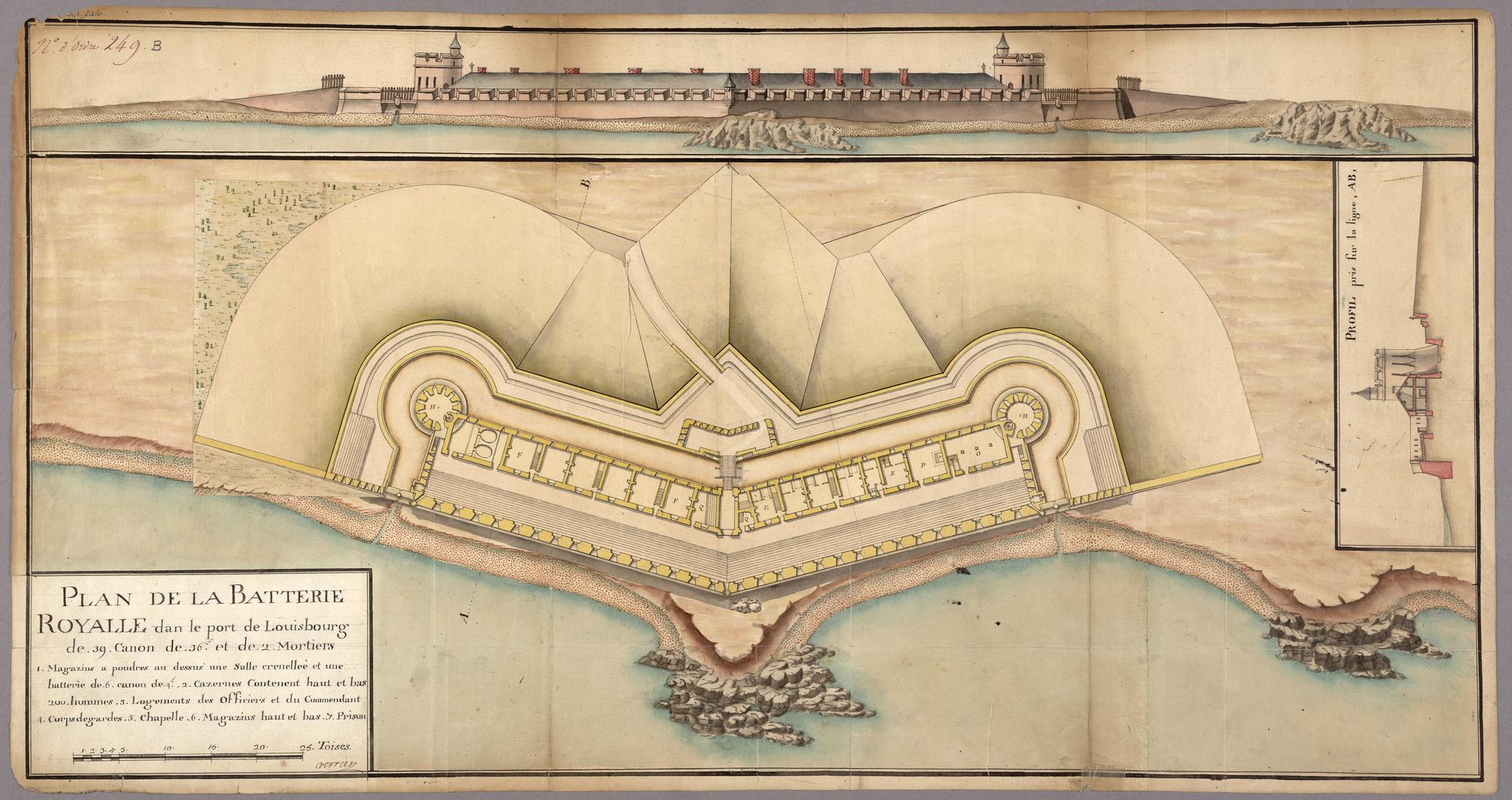 PLAN DE LA BATTERIE ROYALLE dans le port de Louisbourg de .39. Canon de .36. £ et de .2. Mortiers