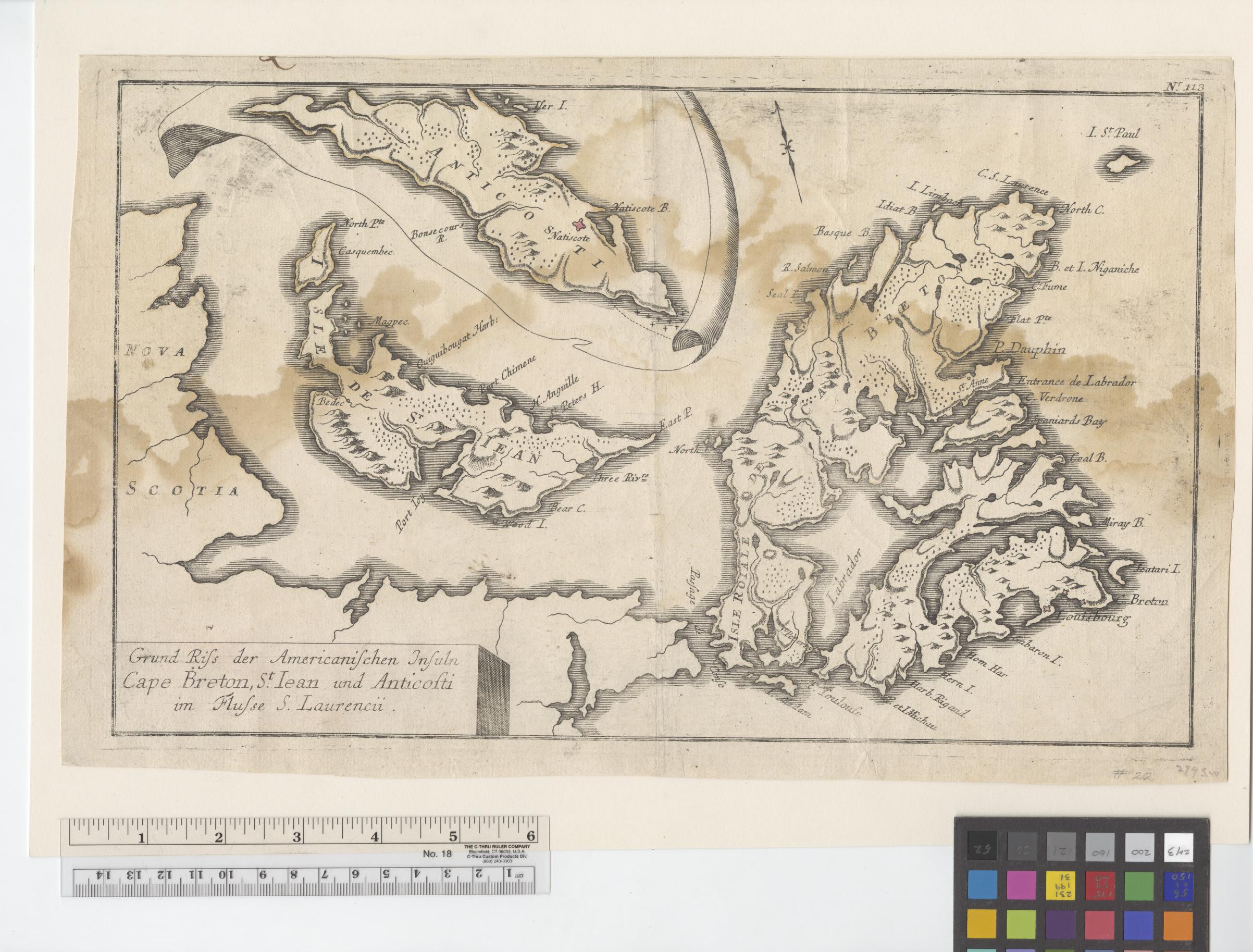 Grund Riss der Americanischen Insuln Cape Breton, St. Iean und Anticosti im Flusse S. Laurencii.