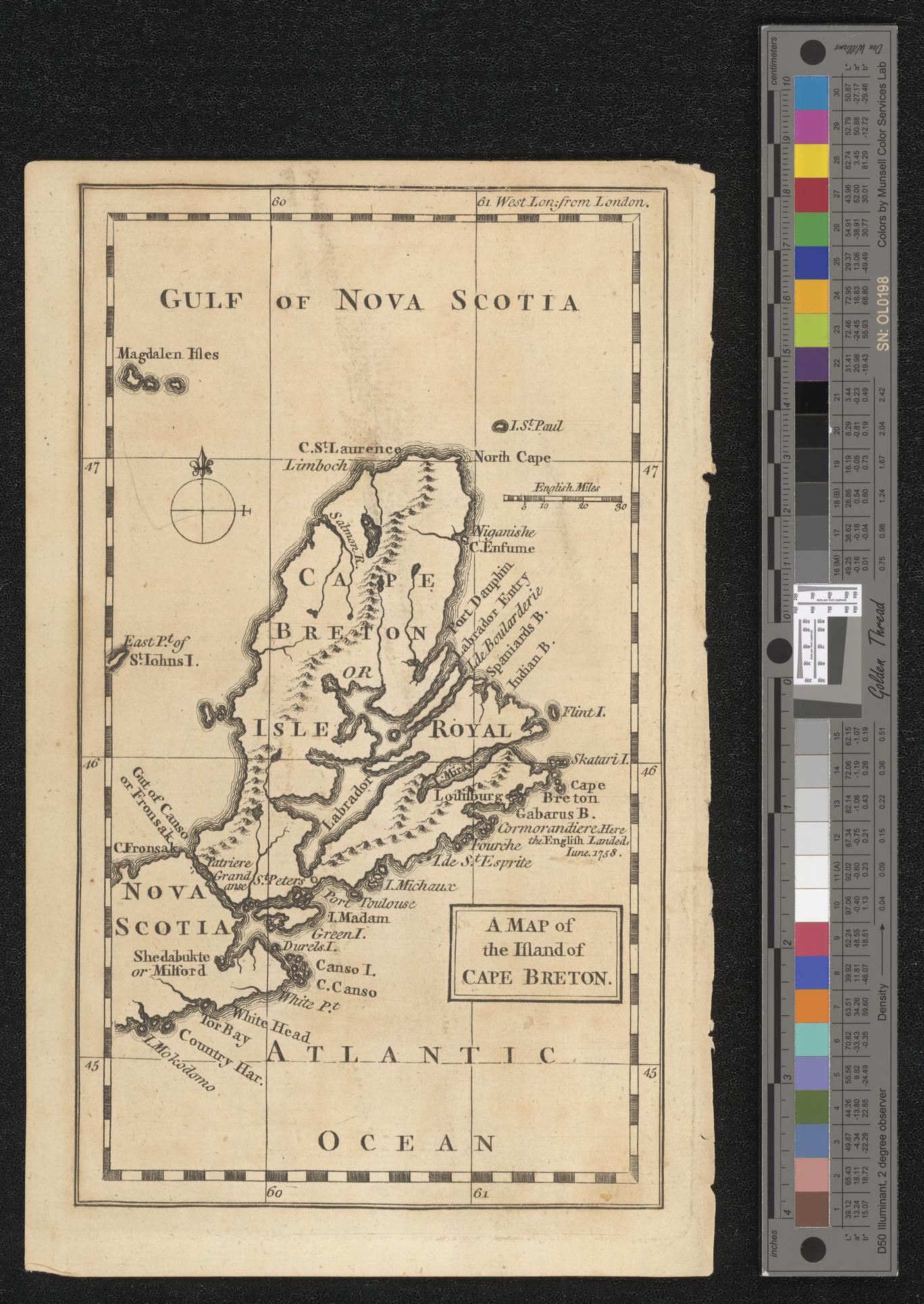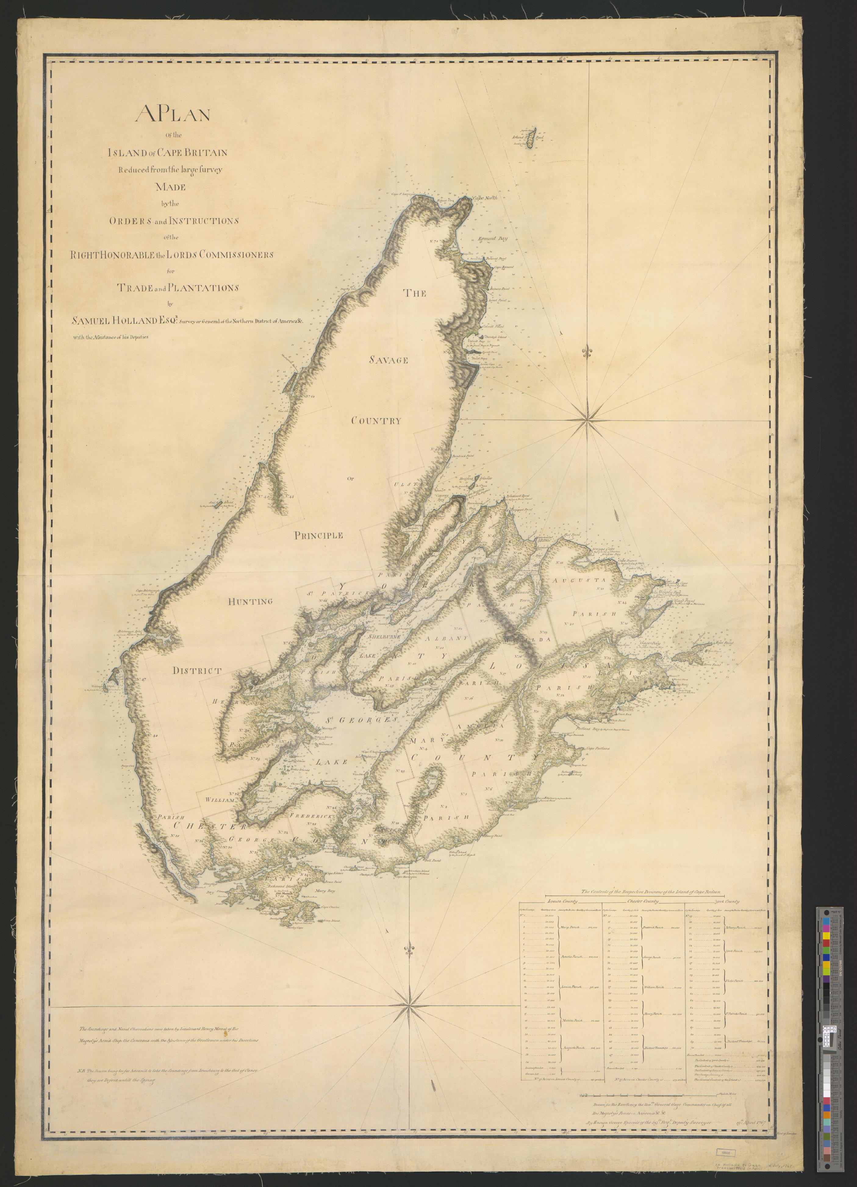 A PLAN of the island of CAPE BRETON Reduced from the large survey MADE by the ORDERS and INSTRUCTIONS of the RIGHT HONORABLE the LORDS COMMISSIONERS for TRADE and PLANTATIONS  by SAMUEL HOLLAND ESQr. Surveyor General of the Northern District of America &c. with the Assistance of his Deputies.