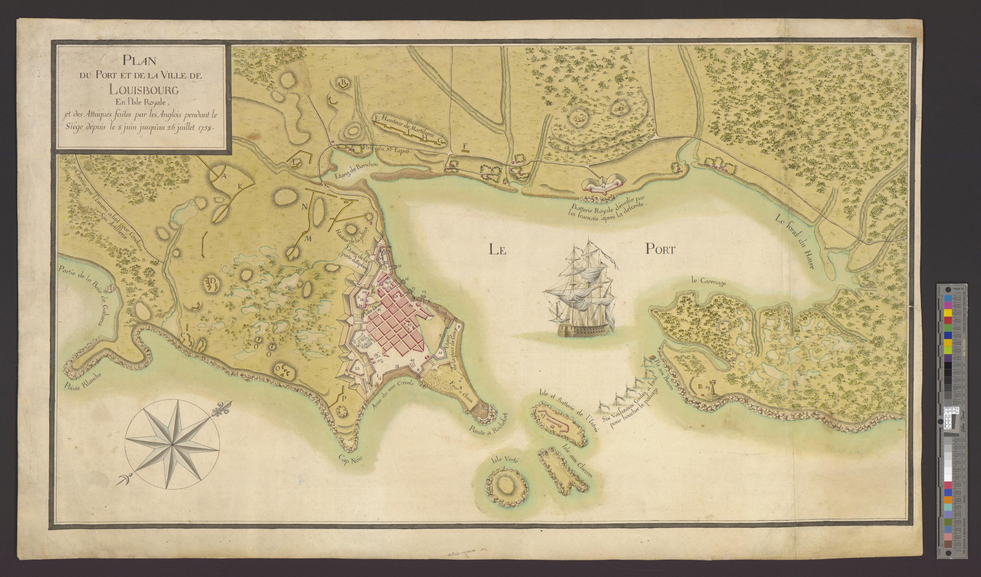 PLAN DU PORT ET DE LA VILLE DE LOUISBOURG en l'Isle Royale,  et des Attaques faites par les Anglois pendant le Siége depuis le 8 juin jusqu'au 26 juillet 1758.
