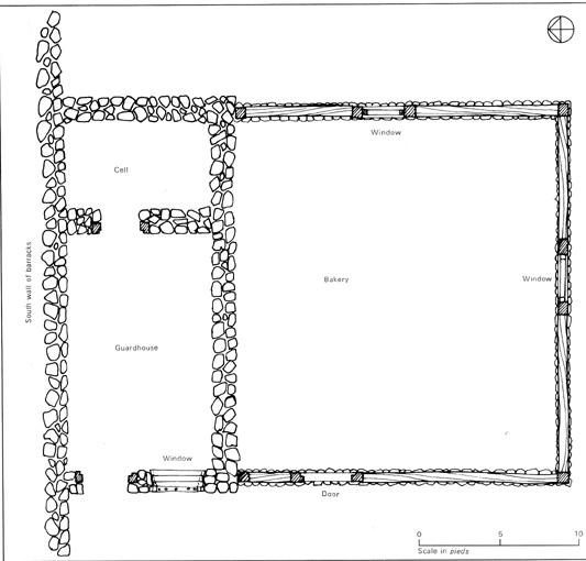 From the dimensions given for the ceiling we know that the building was approximately 24 pieds wide, and 32 pieds long. Elsewhere in the toisé we find that there was only one hip on the roof, so most likely the long axis was at right angles to the adjoining barracks. With this information and, in addition, interpretation of the phrase "les deux faces de la Boulangerie du Corps de Garde et de la Prison joignt. les cazernes" to mean that the cell and probably also the guardhouse were immediately adjacent to the barracks, it is possible to draw up a reasonably accurate plan of the two buildings (Fig. 18.)